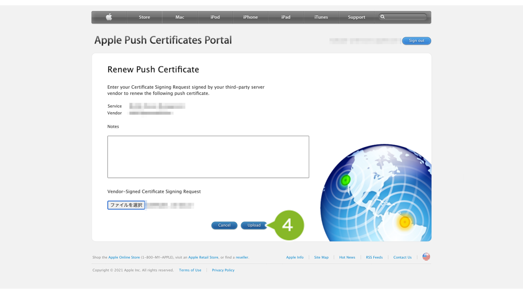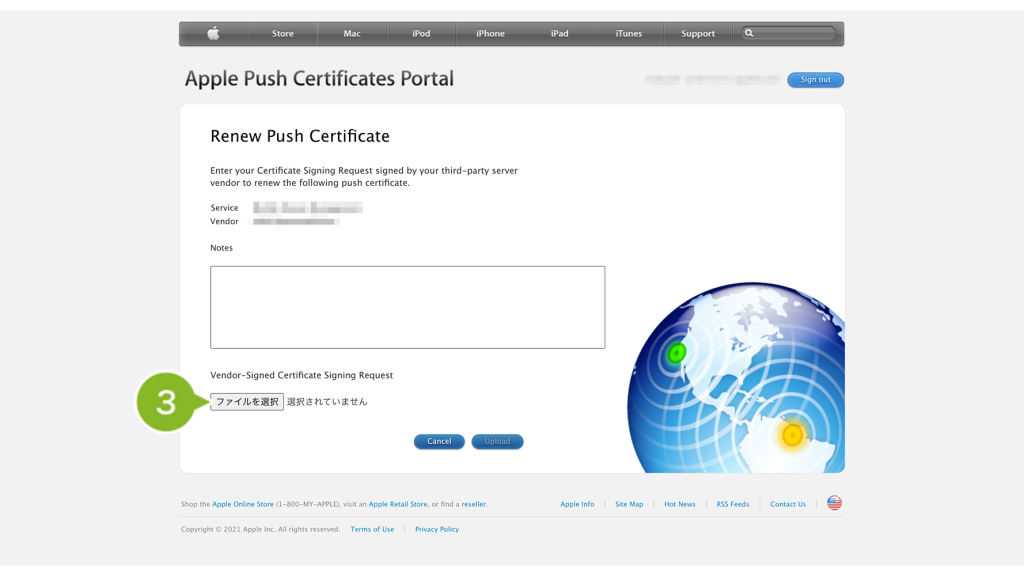 1-4-2:Apple Push Certificate Portal(APCP)でCSR ファイルをアップロードして証明書ファイルを作成する
