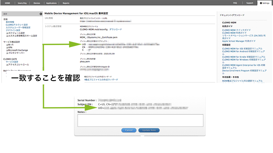 「UID」は CLOMO PANEL と Apple Push Certificate Portal(APCP)画面の両方から確認します。