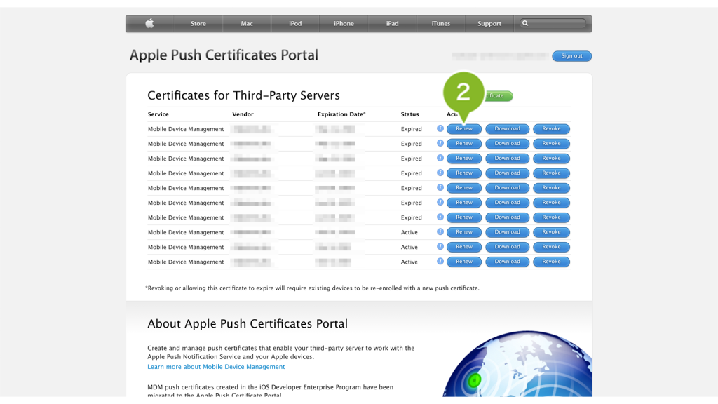 異なる「UID」の証明書情報を持った[Renew]を選択した場合、年次更新は正しくおこなわれず、現在 CLOMO の管理下にある iOS デバイスの管理がおこなえなくなりますのでご注意ください。
