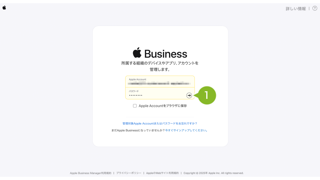 1. Apple Business Manager(ABM)へアクセスし「Apple Account」と「パスワード」を入力後、矢印マークをクリックしてログインします。