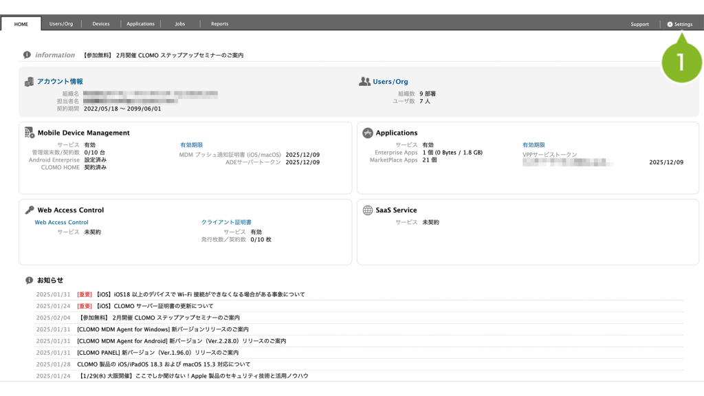 1. CLOMO PANEL ログイン後、[Settings]をクリックします。