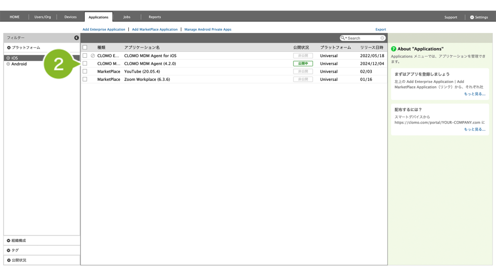 1. CLOMO PANEL にログイン後、[Applications]をクリックします。