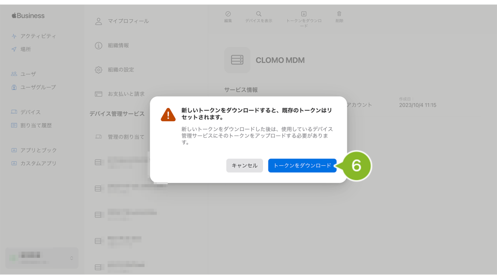 5. コンテンツトークンから CLOMO MDM で利用中のサービストークンの[ダウンロード]をクリックします。