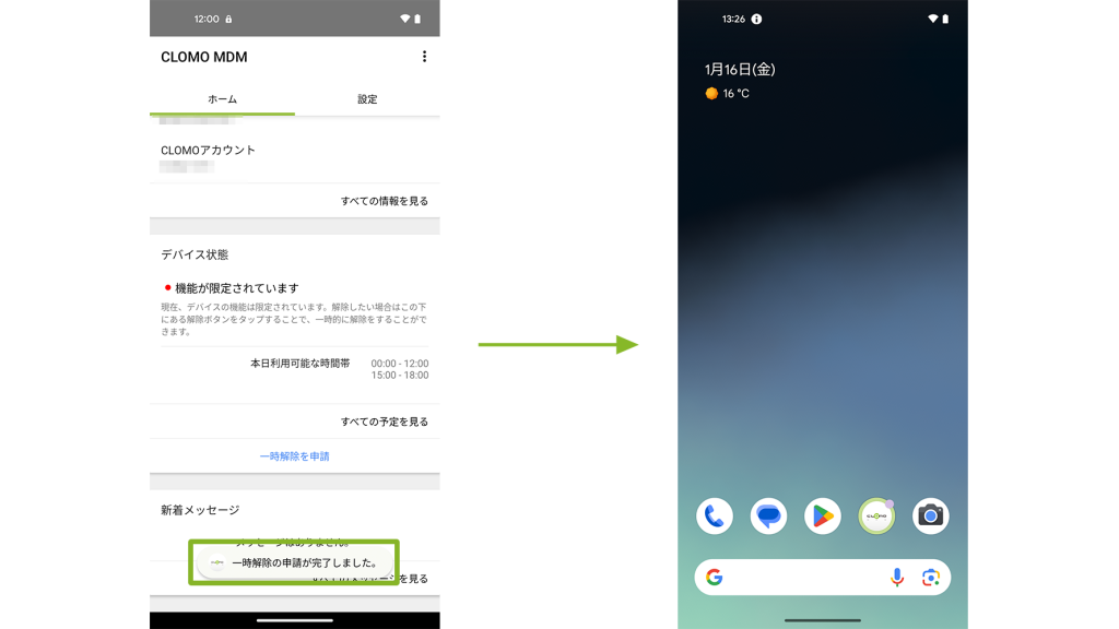 CLOMO MDM Agent for Android をタップ後、[一時解除を申請]をタップし[申請する]をタップします。