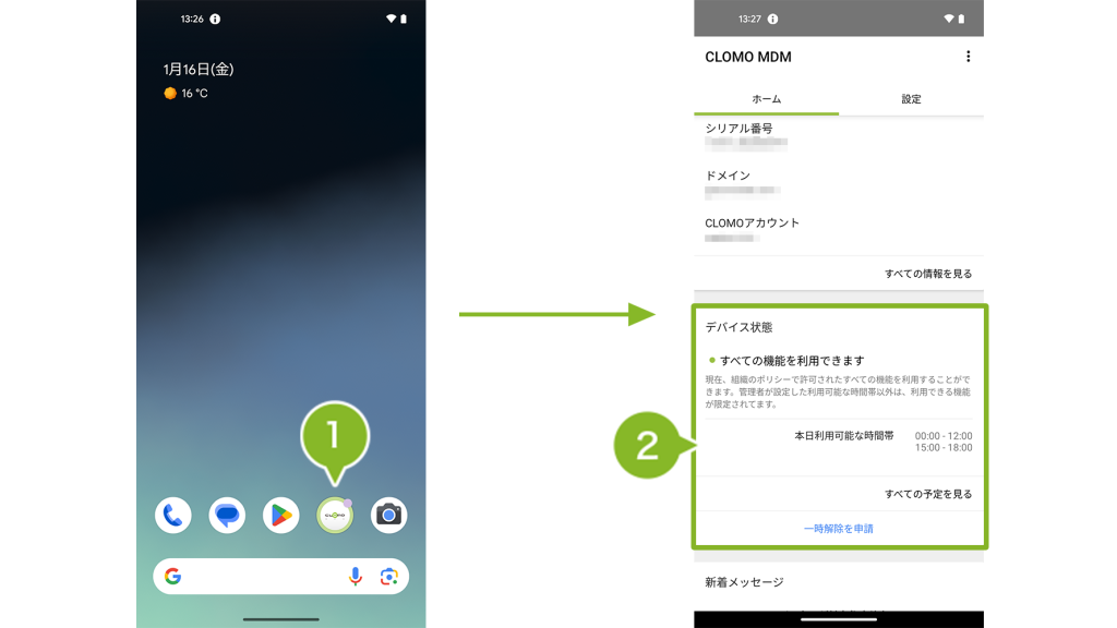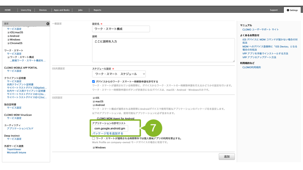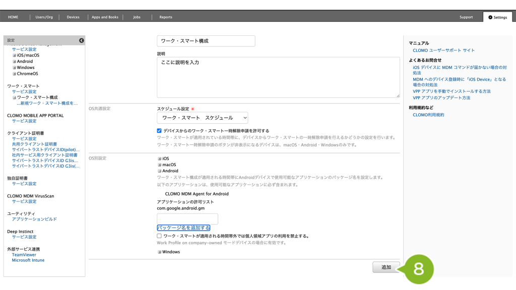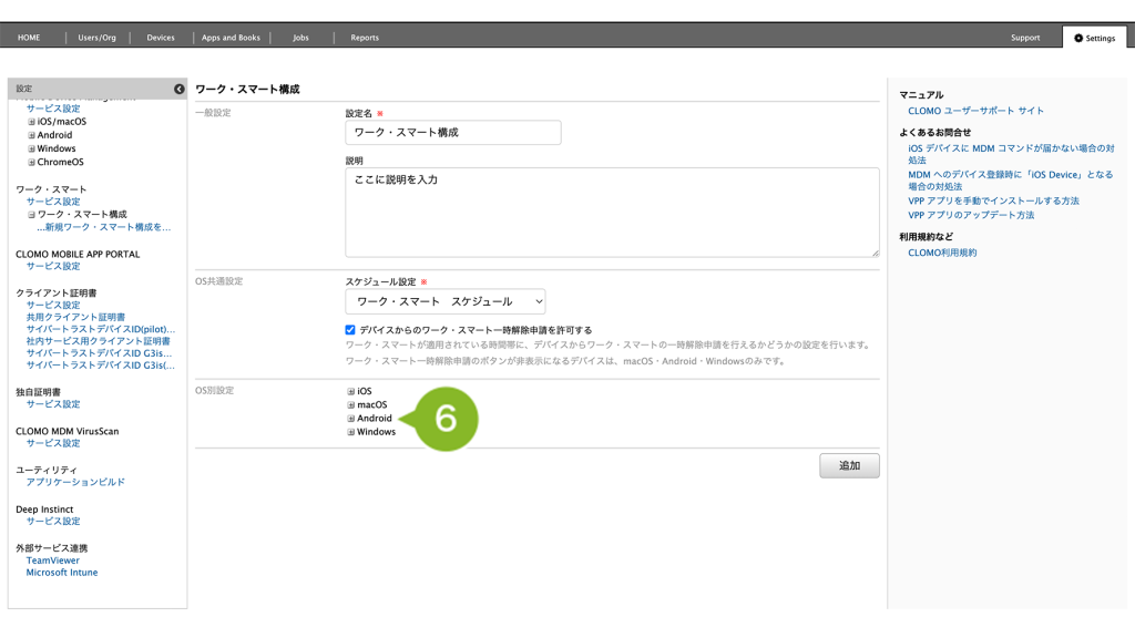 ワーク・スマートは、CLOMO MDM の管理者が設定をおこない、全社または組織単位でデバイスに適用されます。