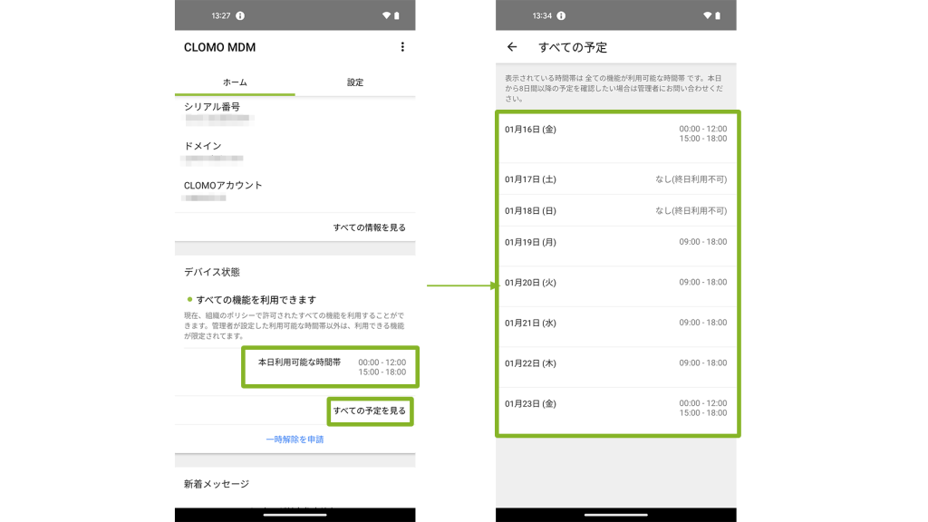 デバイスの機能が限定されている場合、時間外利用申請ができます。