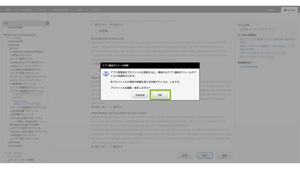 デバイスに適用済みのアプリ管理設定プロファイルを編集すると、確認画面が表示されます。