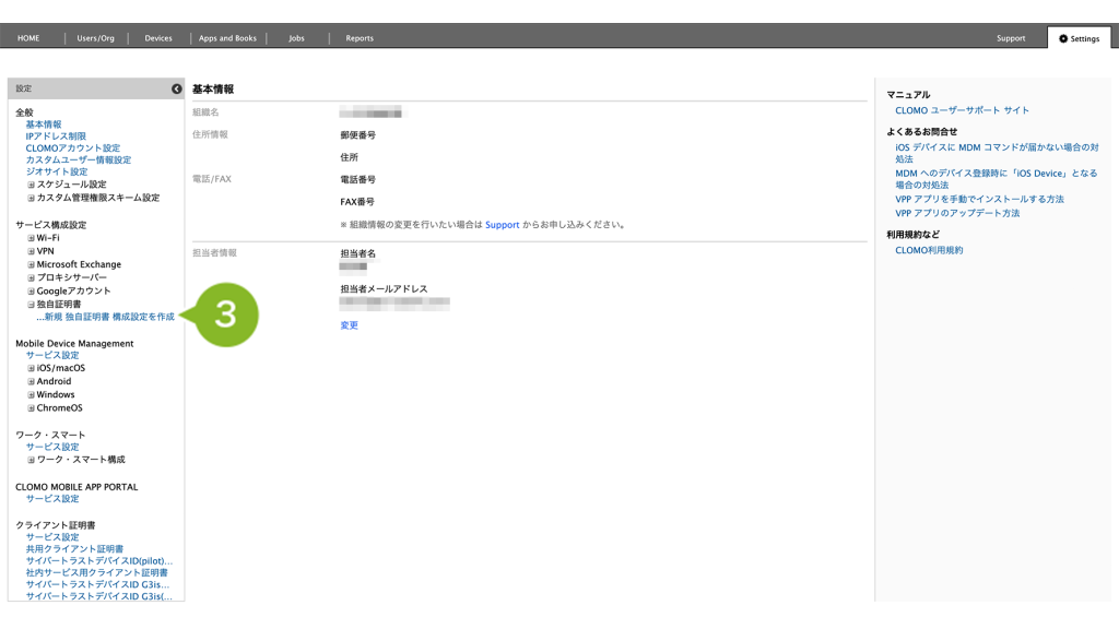 2. サービス構成設定の[独自証明書]をクリックします。