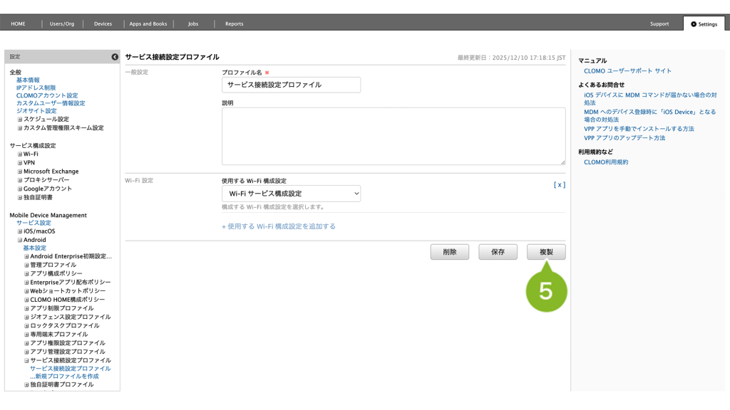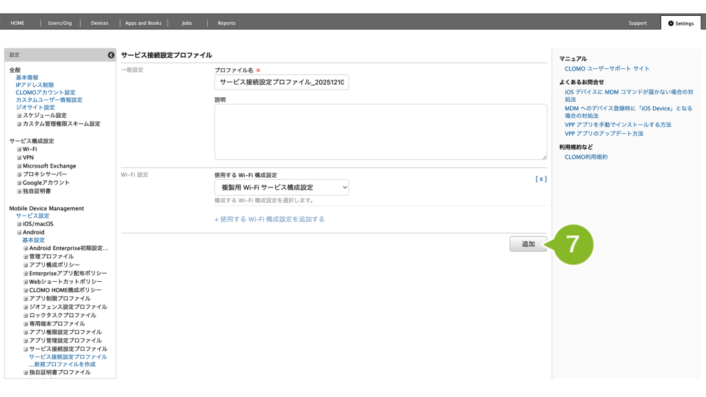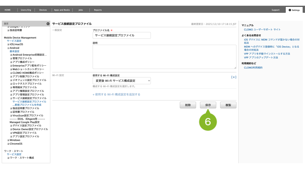 編集完了後、該当の「サービス接続設定プロファイル」を個別適用しているデバイスには、プロファイルの再適用が必要です。