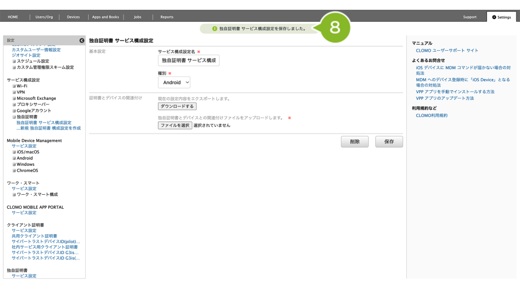 サービス構成設定「独自証明書」の作成がお済みでない場合は、こちらをご参照ください。