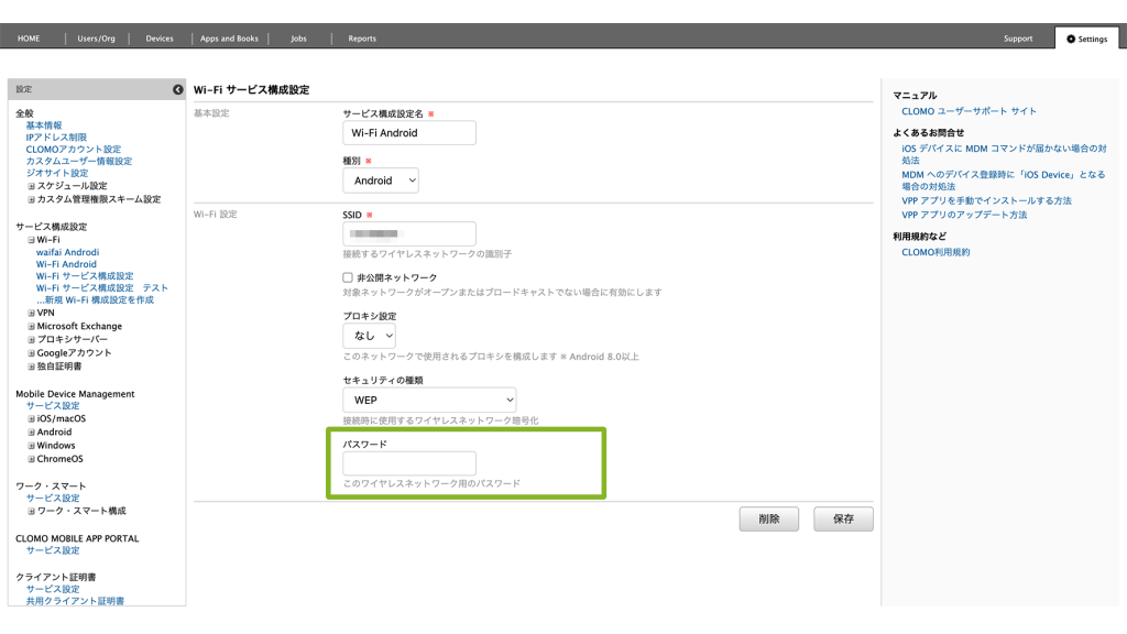 ・サービス構成設定:利用する Wi-Fi 情報や独自証明書を設定します。