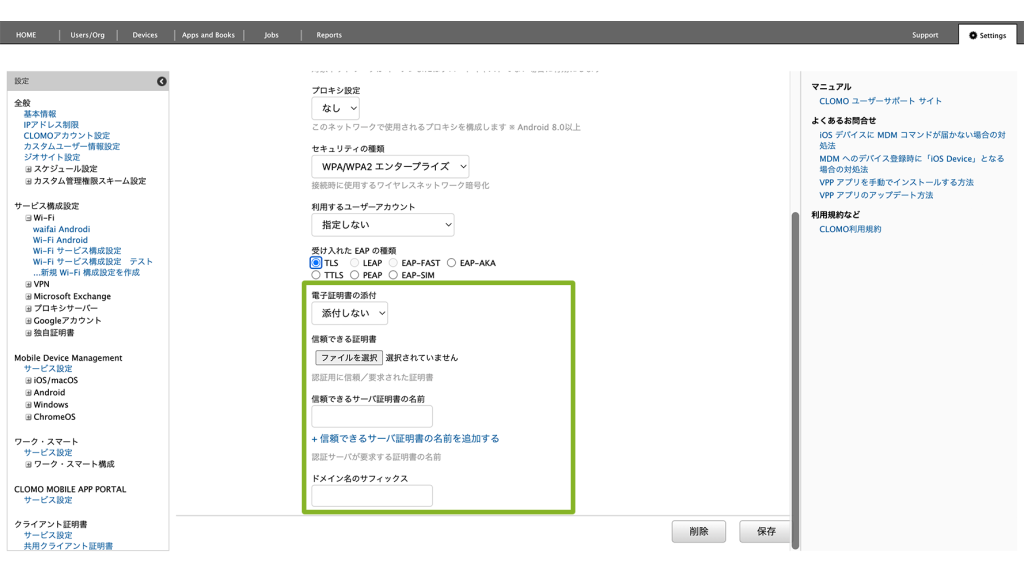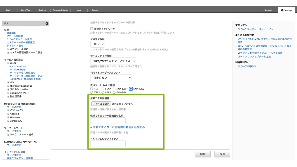 作成後、Wi-Fi サービス構成設定に作成した設定を組み込みます。設定方法は、サービス構成設定「独自証明書」で設定した情報を組み込む場合をご参照ください。