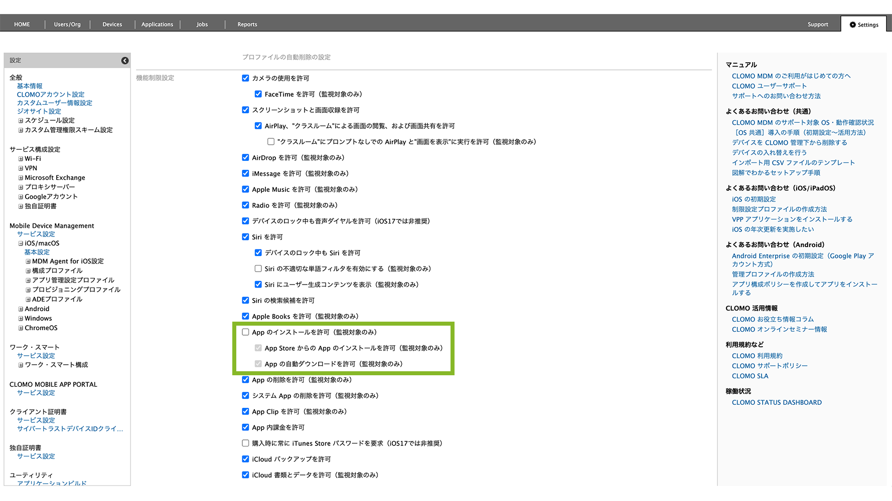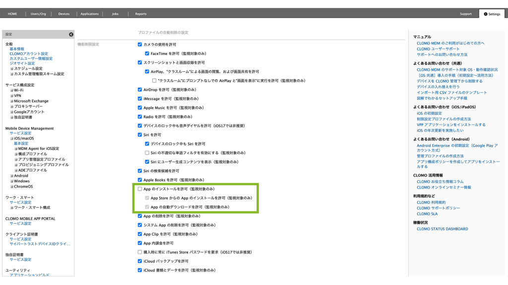 制限設定プロファイルの「機能制限設定」から、「App のインストールを許可(監視対象のみ)」のチェックを外します。
