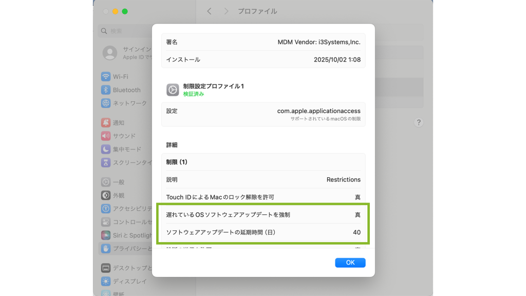 iOS は[設定]>[一般]>[VPN とデバイス管理]>[CLOMO-MDM]>[機能制限]から、macOS は[システム設定]>[プライバシーとセキュリティ]>[プロファイル]から設定の確認ができます。
