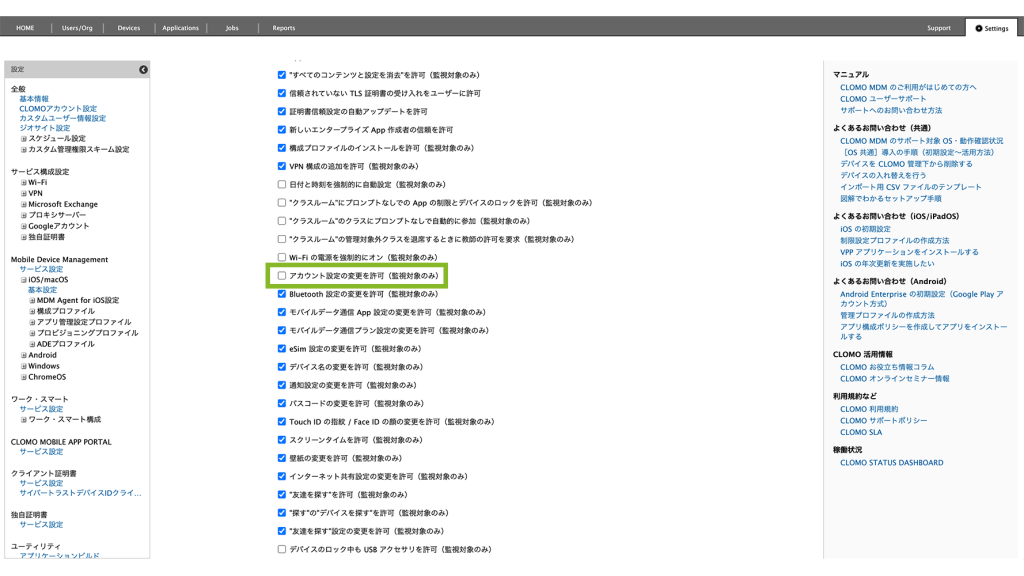 制限設定プロファイルの「機能制限設定」から、「アカウント設定の変更を許可(監視対象のみ)」のチェックを外します。