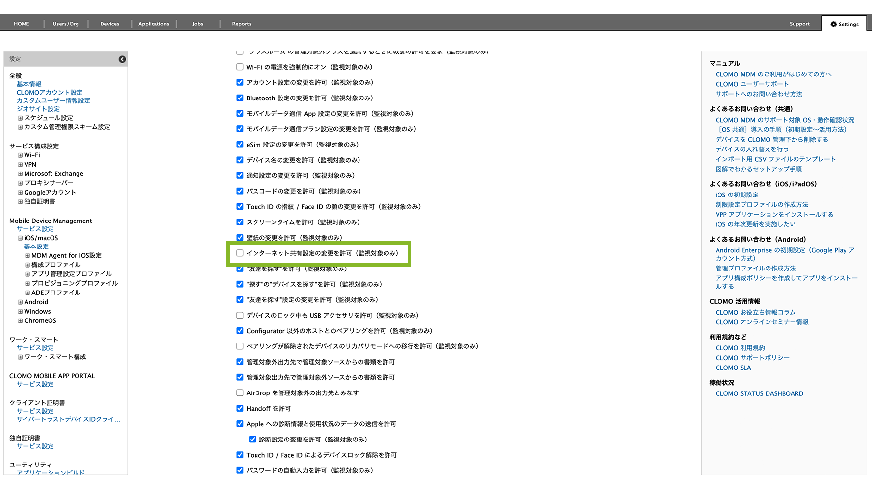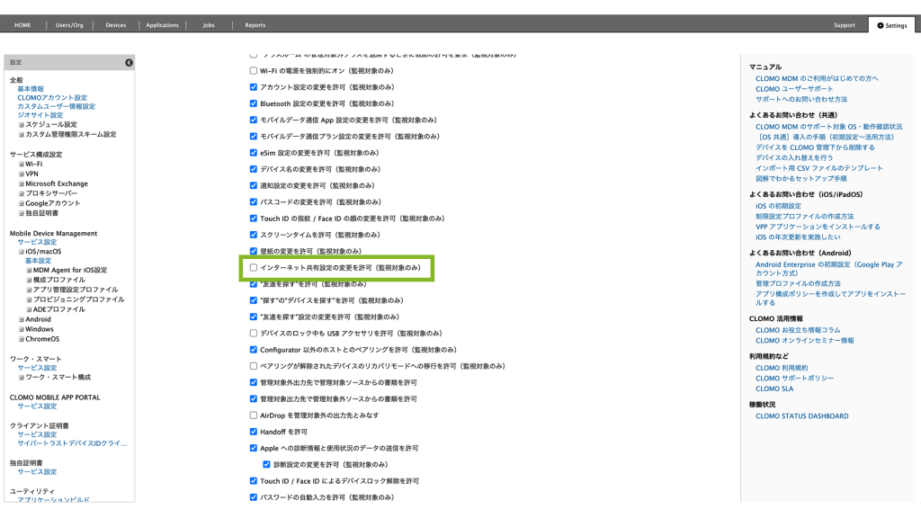 制限設定プロファイルの「機能制限設定」から、「インターネット共有設定の変更を許可(監視対象のみ)」のチェックを外します。