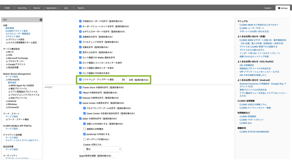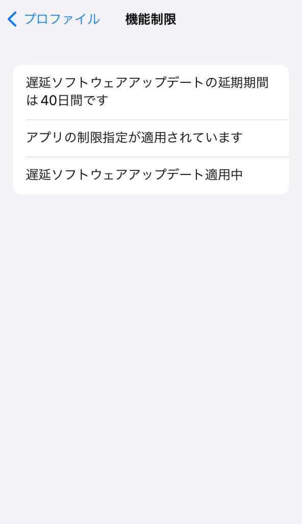 制限設定プロファイルの「機能制限設定」から、「ソフトウェア・アップデート遅延」にチェックを入れて、日数を設定します。