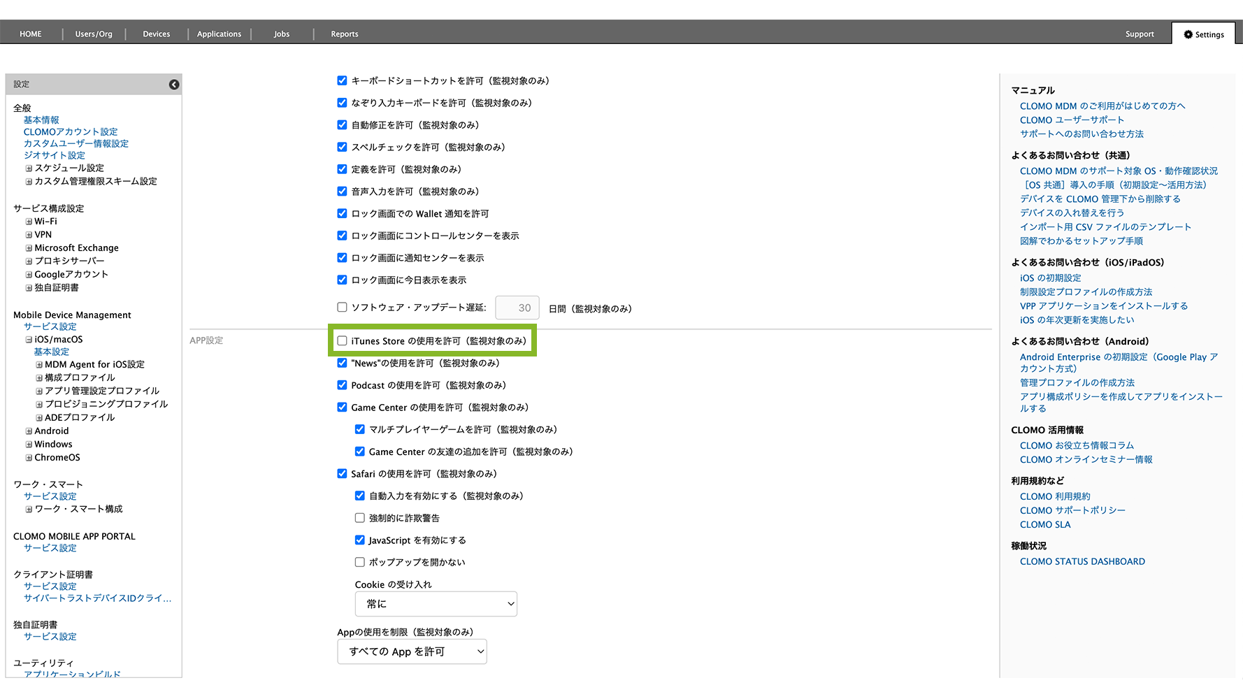 制限設定プロファイルの「APP設定」から、「iTunes Store の使用を許可(監視対象のみ)」のチェックを外します。