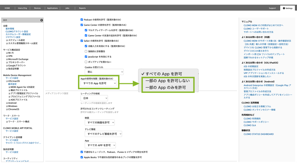 制限設定プロファイルの「APP設定」から、「Appの使用を制限(監視対象のみ)」の[すべての App を許可]をクリックして、[一部の App を許可しない]もしくは[一部の App のみを許可]をクリックします。