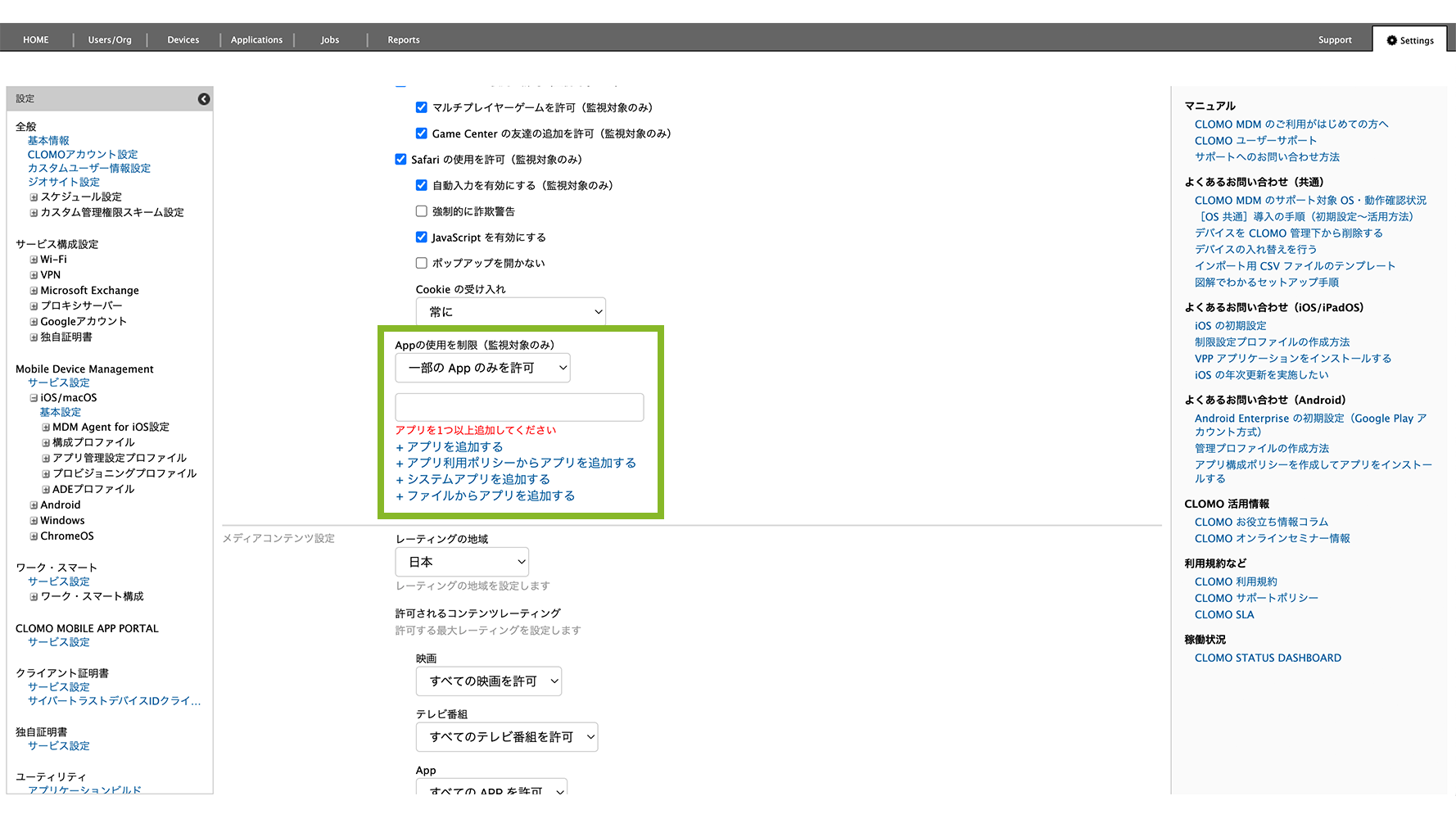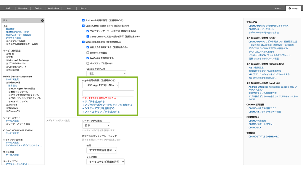 本ページでは設定箇所の一部を抜粋してご紹介しています。制限設定プロファイル作成の全体の流れについては、制限設定プロファイルを作成するをご確認ください。