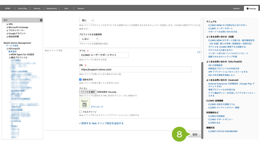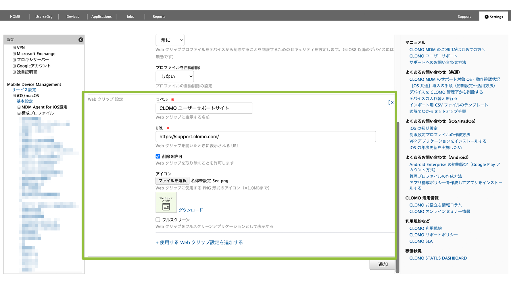 ※ Web クリップ設定でアイコンを指定している場合、設定の更新時にアイコンをクリアすることはできません。アイコンを削除したい場合は、一度 Web クリップ設定を削除してから、再作成する必要があります。