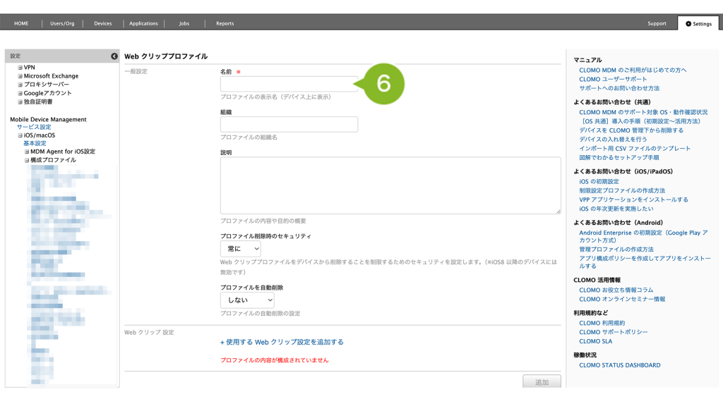 6. Web クリッププロファイル画面が表示されます。プロファイル名を入力します。設定は必須です。