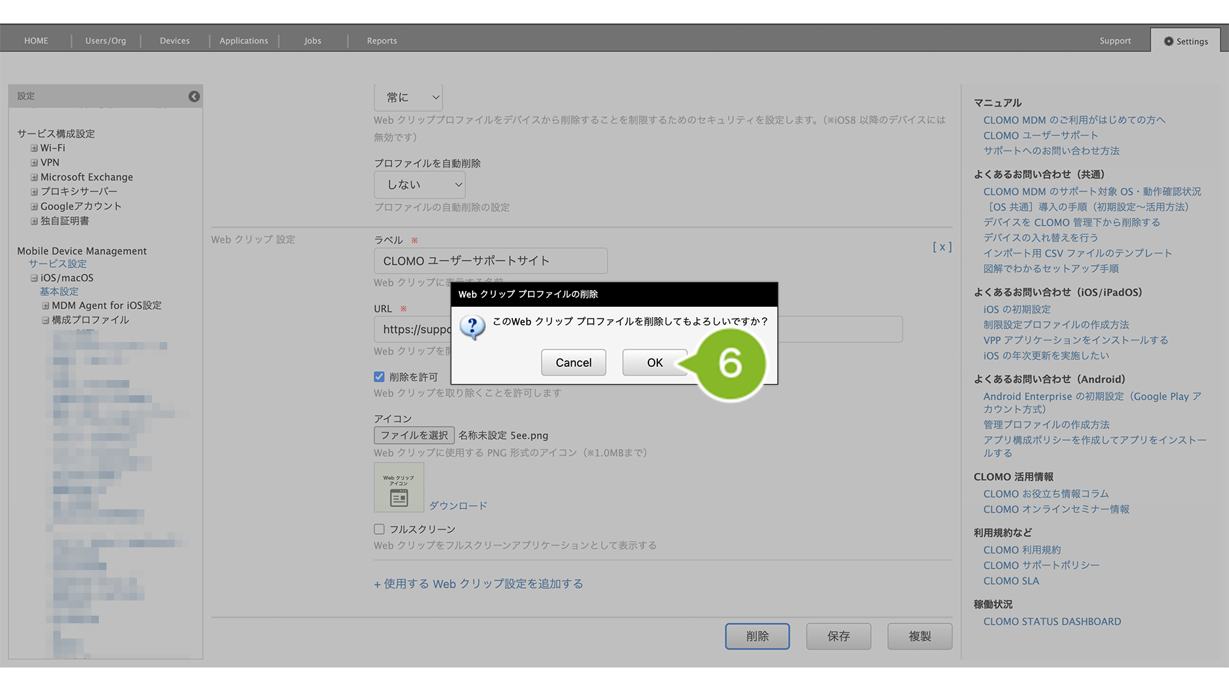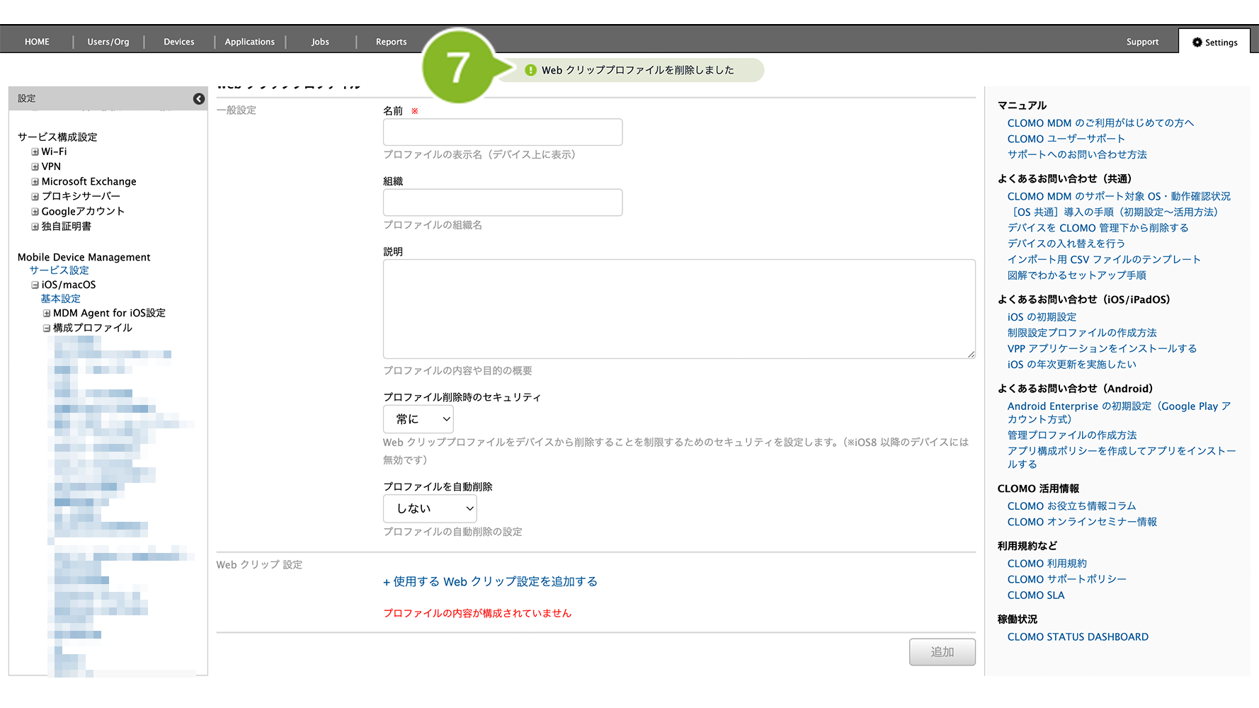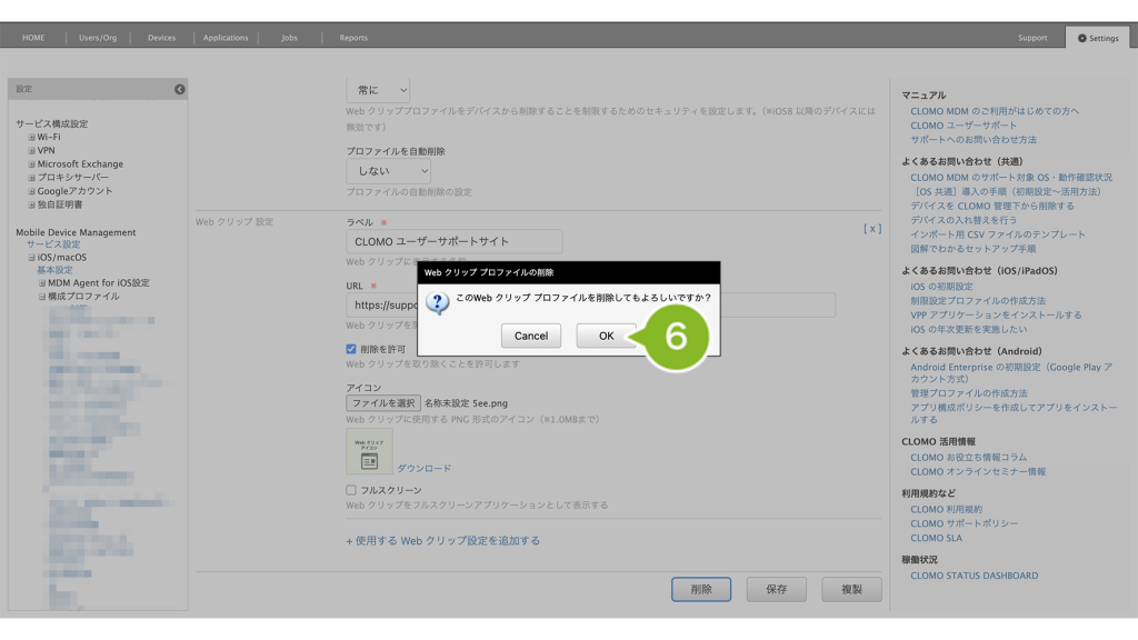 「Web クリッププロファイル」を個別適用しているデバイスには、削除コマンドの実行が必要です。