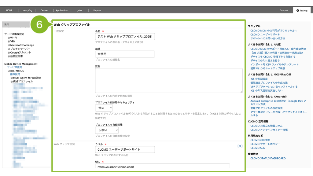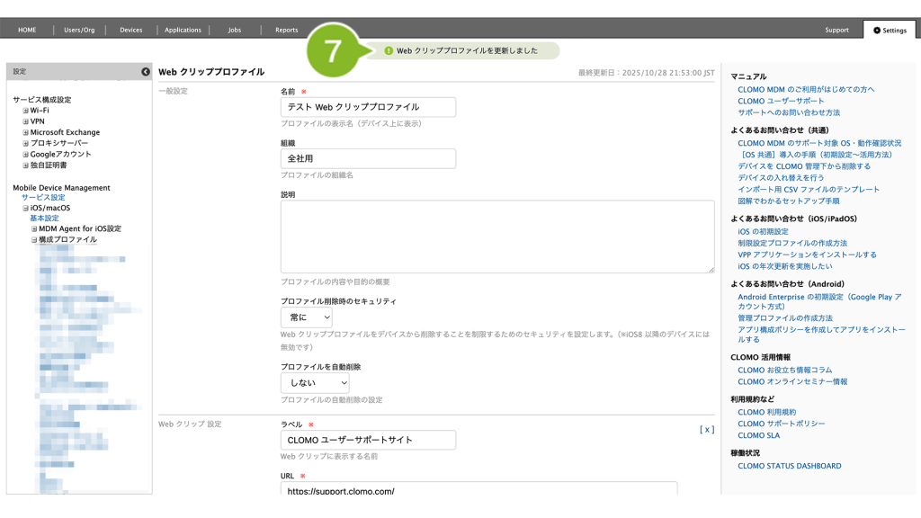 編集完了後、該当の「Web クリッププロファイル」を個別適用しているデバイスには、プロファイルの再適用が必要です。