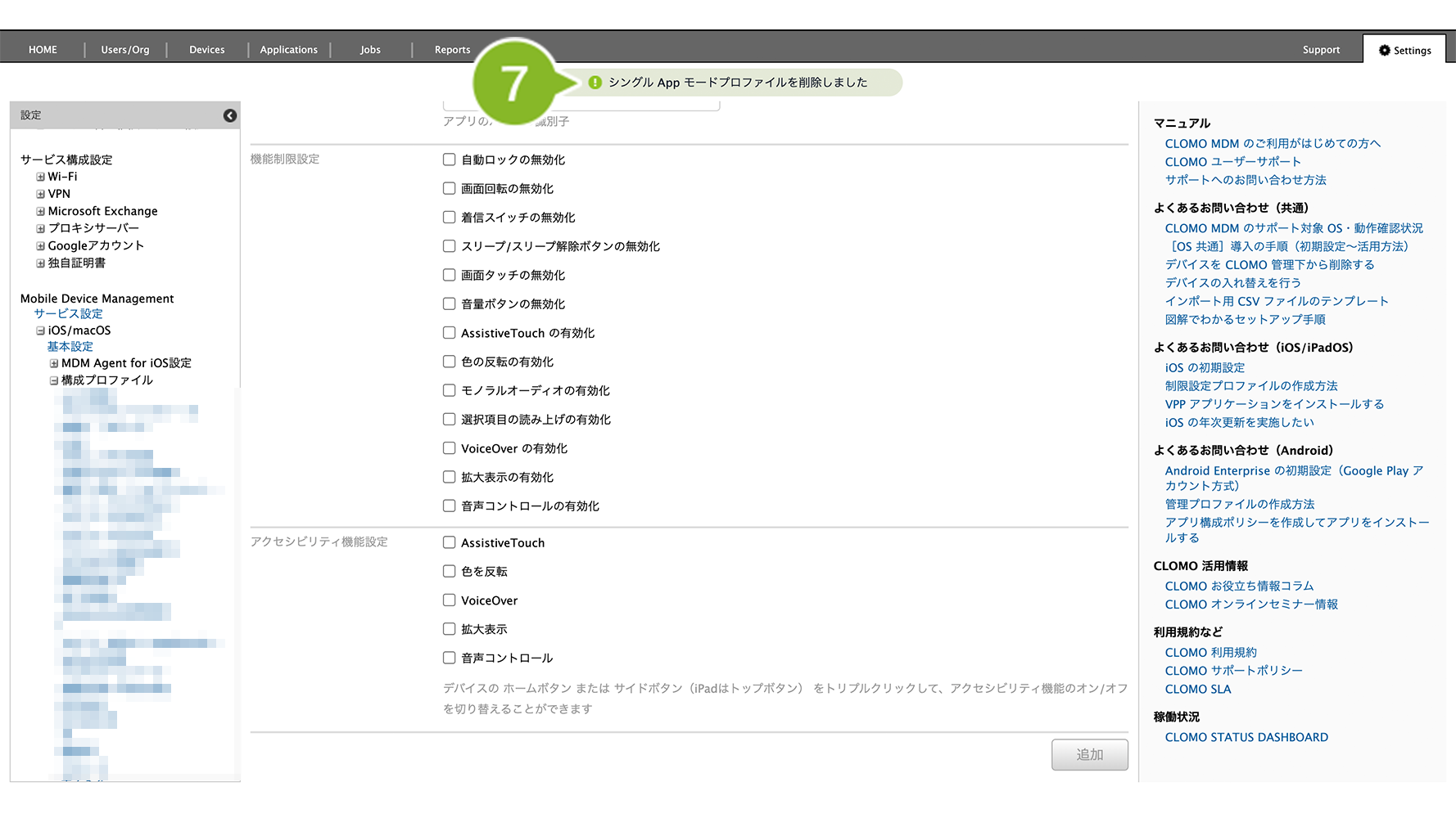 「シングル App モードプロファイル」を個別適用しているデバイスには、削除コマンドの実行が必要です。