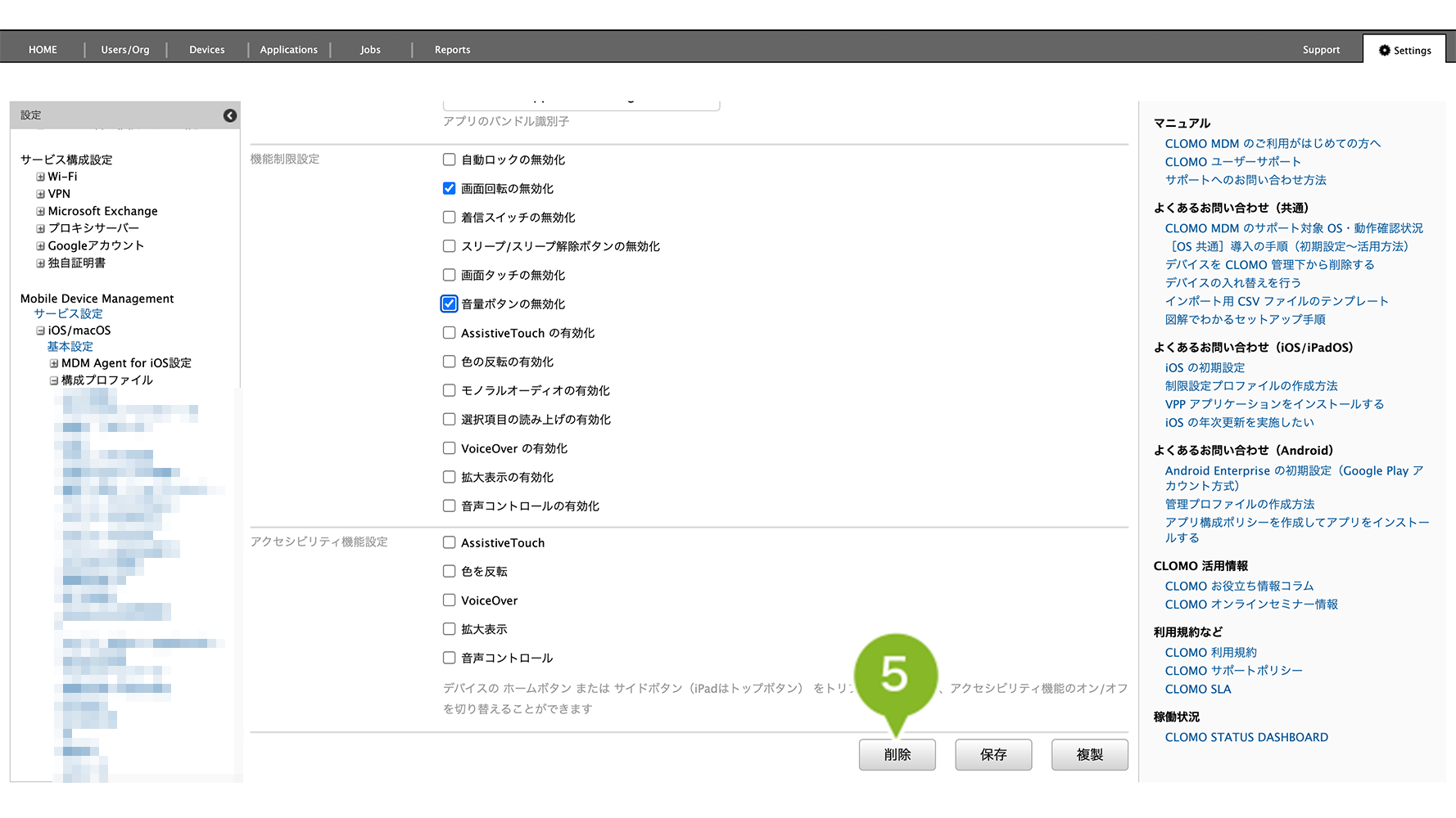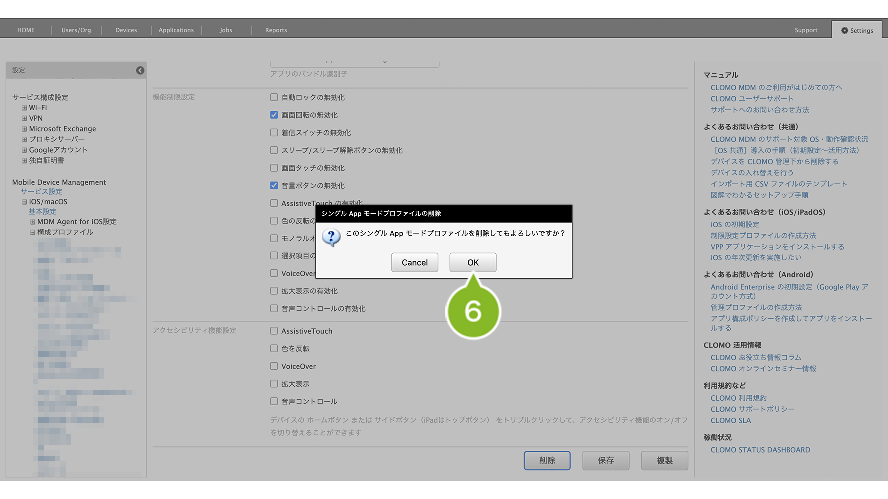 「シングル App モードプロファイル」の削除手順は、以下のとおりです。
