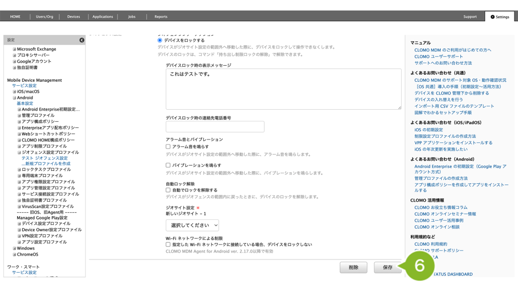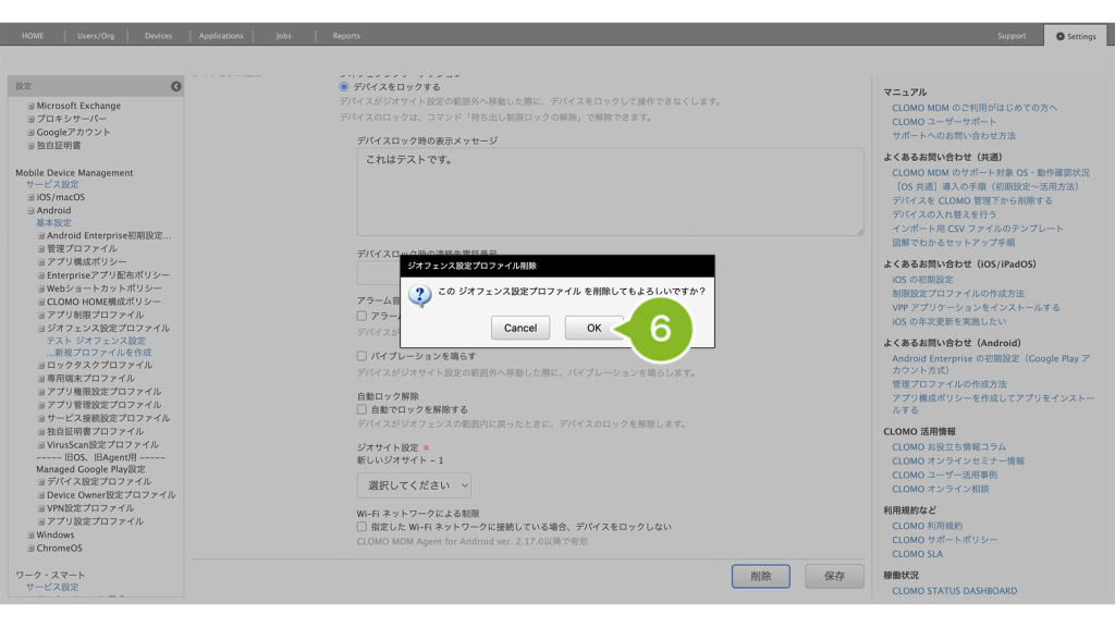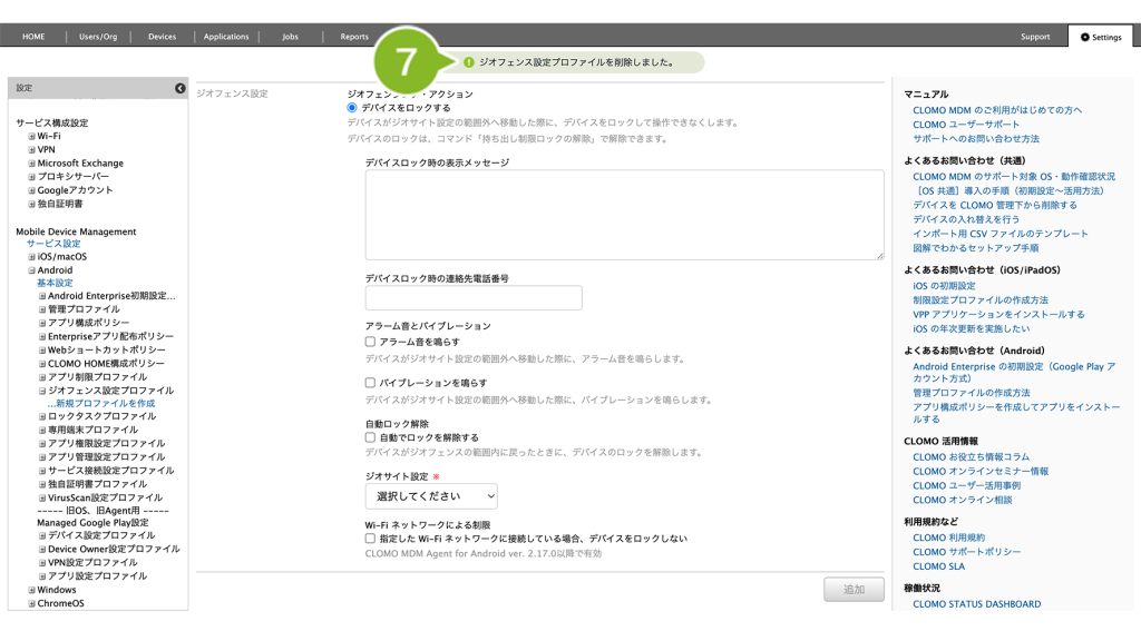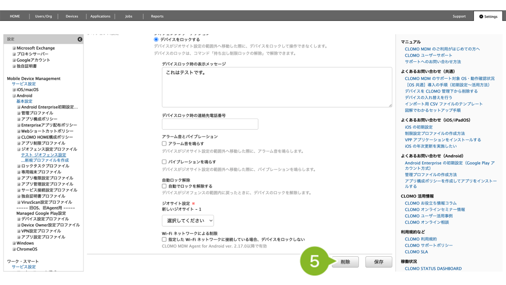 ・作成済みのジオフェンス設定プロファイルを削除する場合