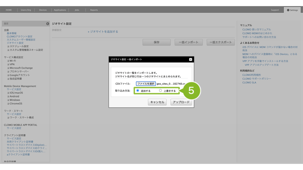 上書きする登録済みのジオサイトをすべて CSV ファイルの内容で上書きします。 CSV ファイルに無いジオサイトは削除されます。