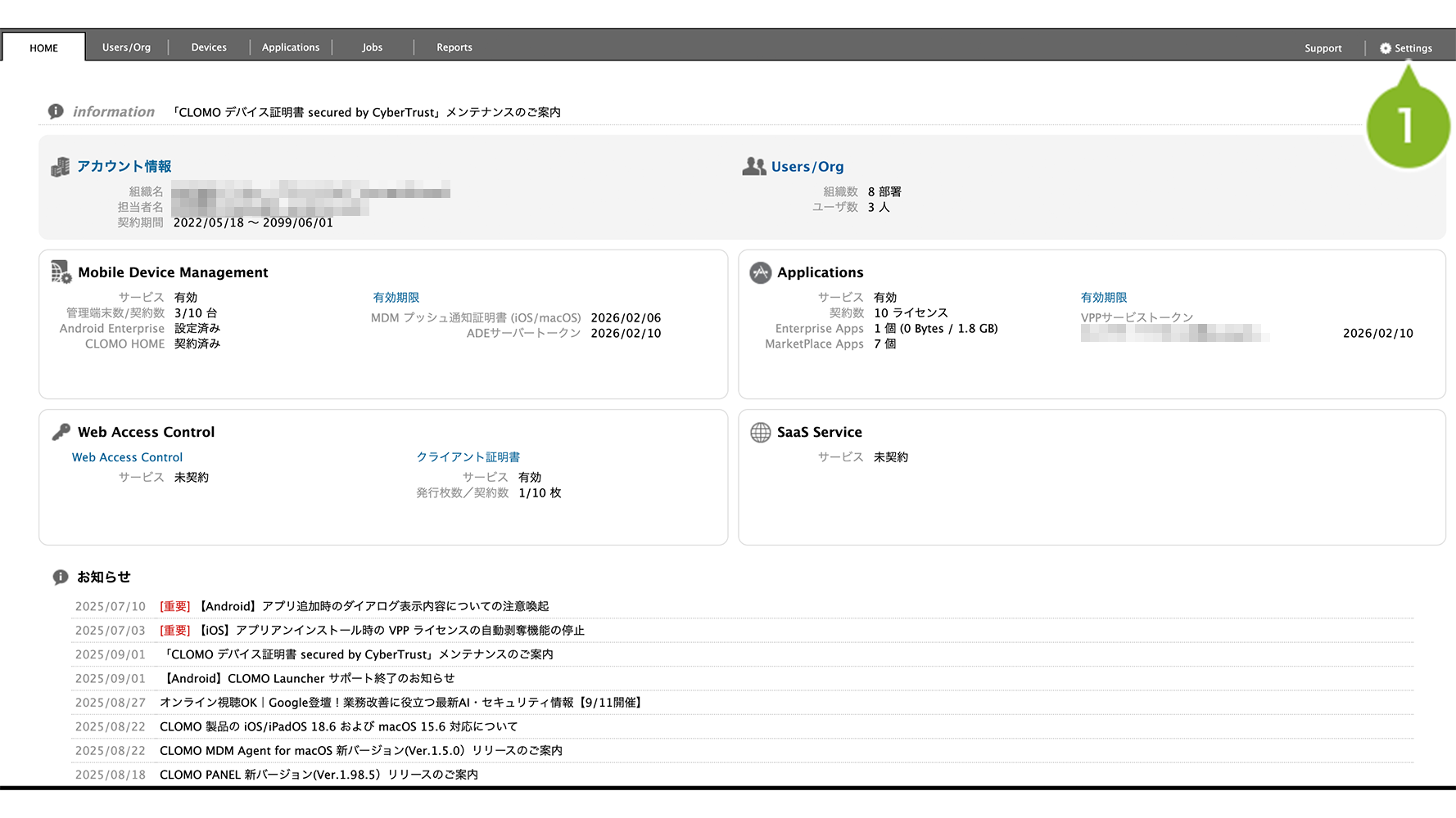 1. CLOMO PANEL にログイン後、[Settings]をクリックします。