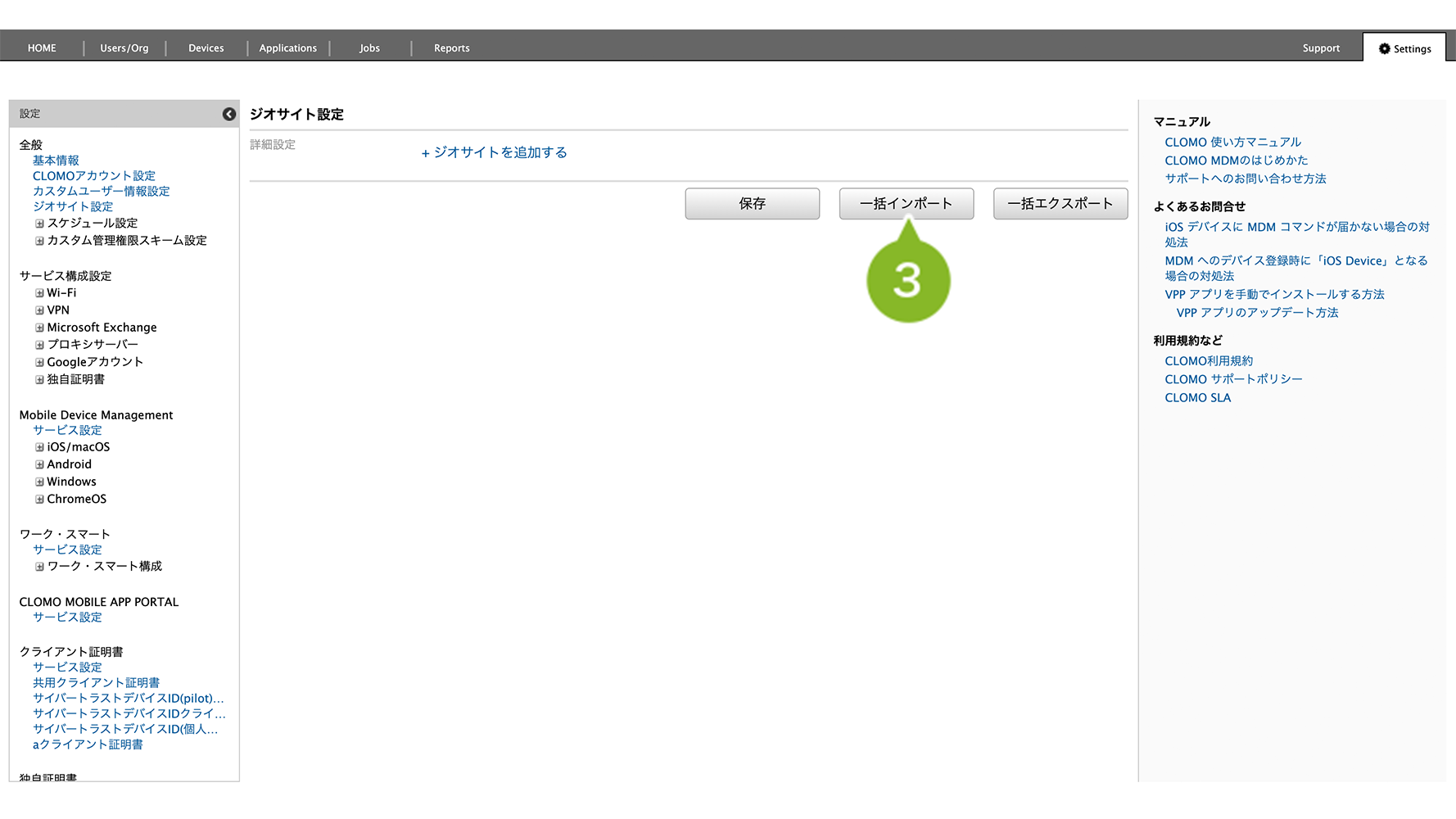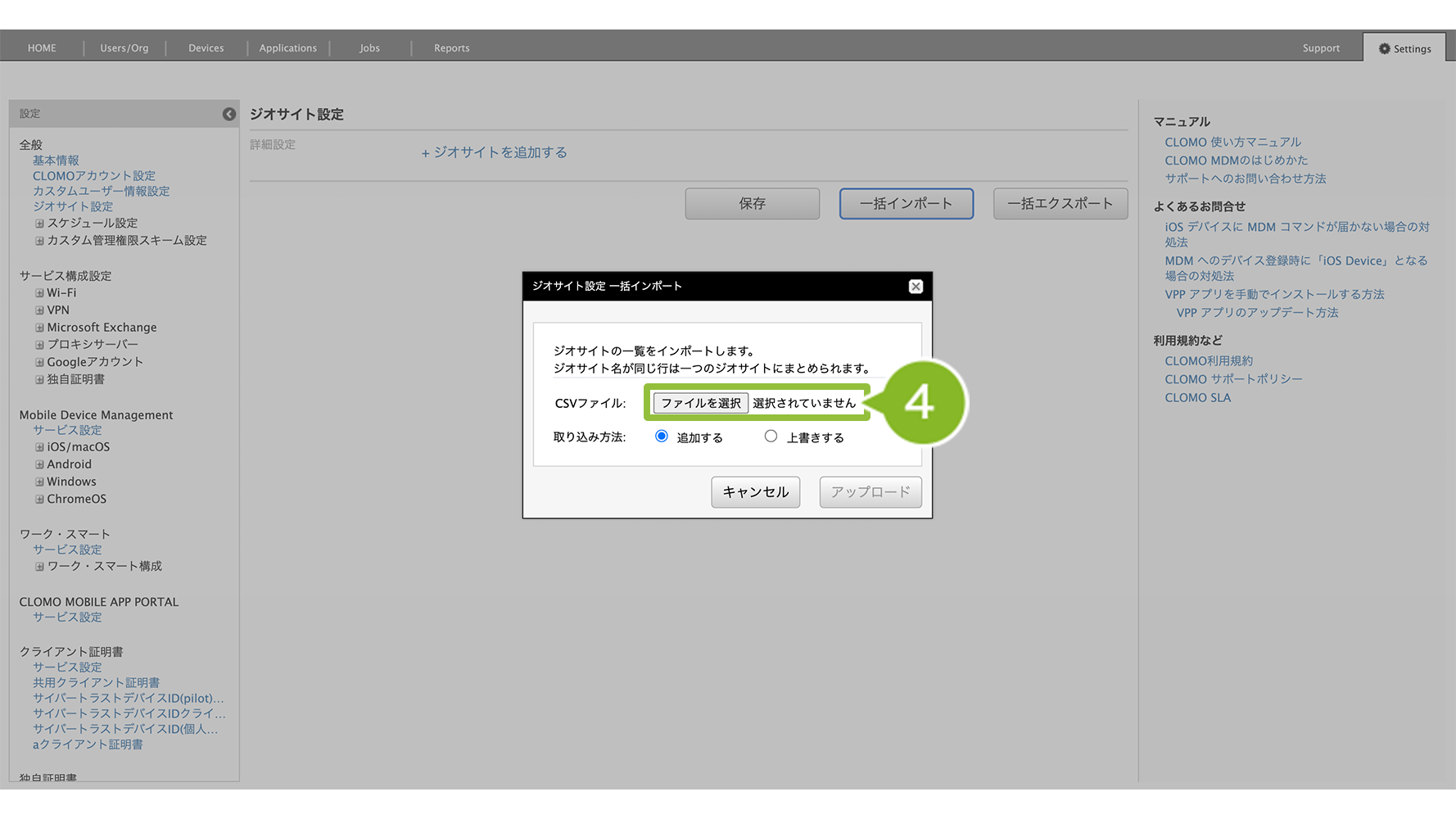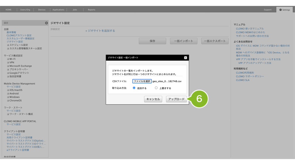 CSV ファイルをあらかじめ作成する必要があります。作成例は、ジオサイト設定 CSV ファイルの書式と作成例をご確認ください。作成後、以下の手順に沿ってインポートを実施してください。