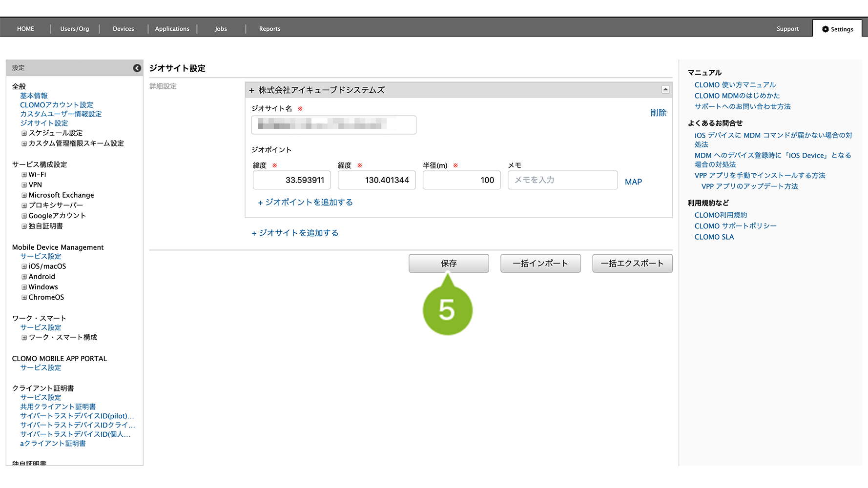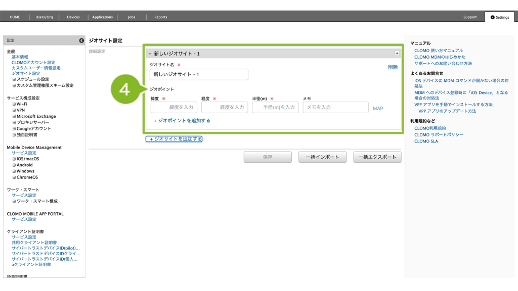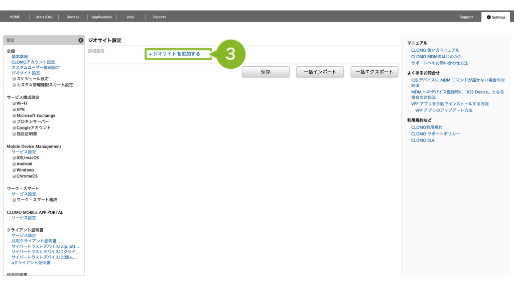 ジオフェンス設定プロファイルを作成する前に、前準備としてジオサイト設定を実施する必要があります。