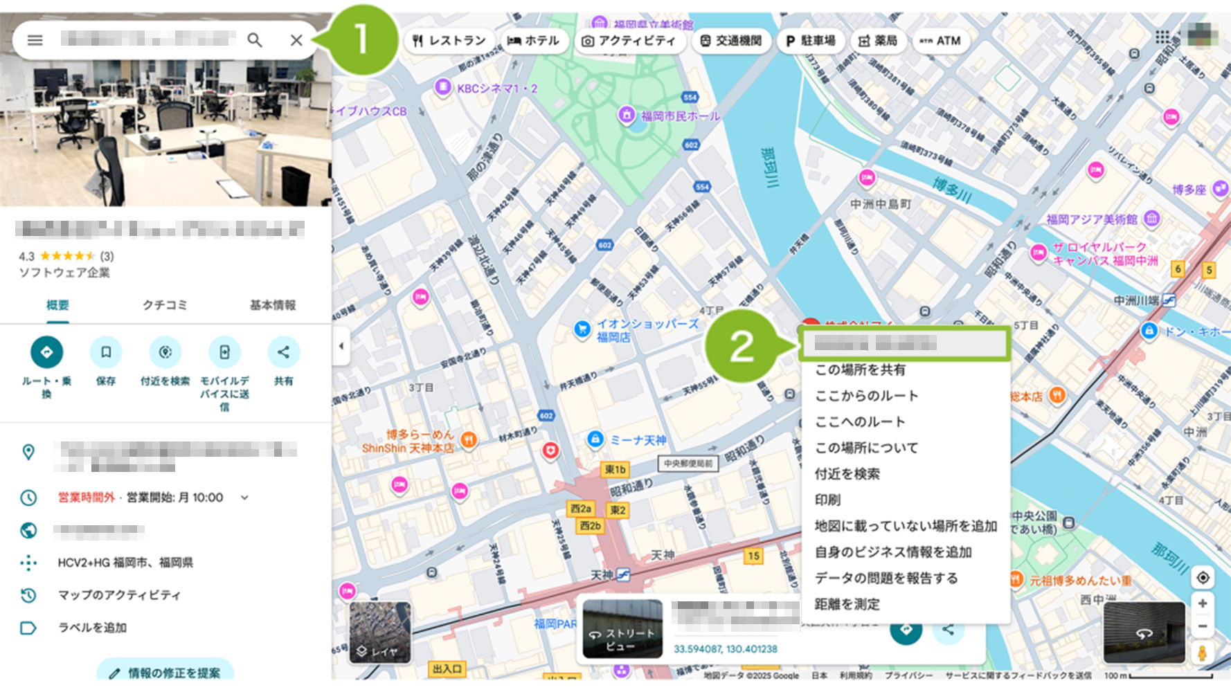 2. 目的地を右クリックすると、緯度と経度が表示されます。画像の場合、「33.59...」が緯度、「130.4...」が経度です。