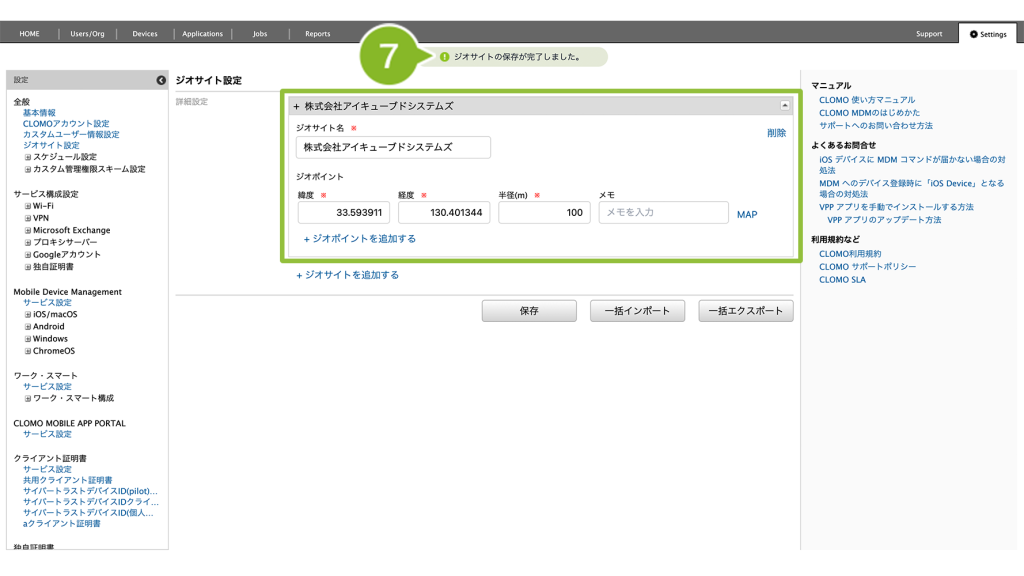 7. 「保存完了」のお知らせが表示されて、ジオサイト設定が表示されれば完了です。