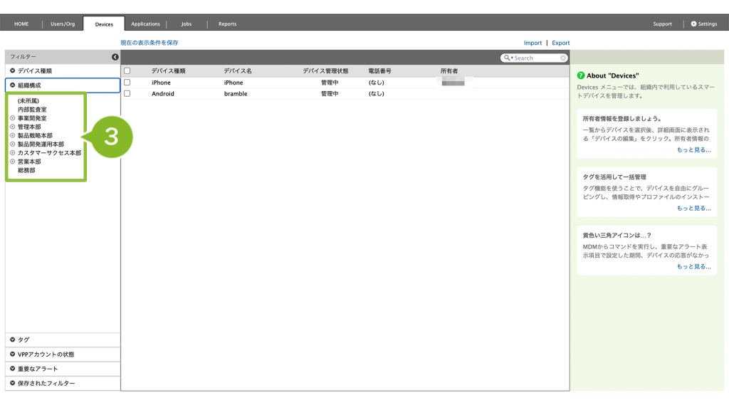 2. フィルターの[組織構成]をクリックします。