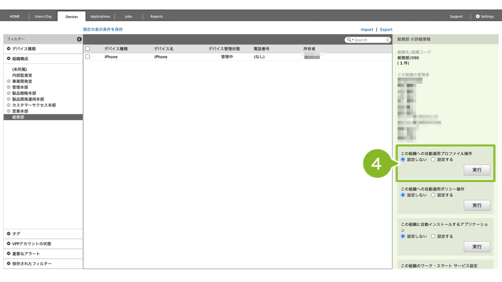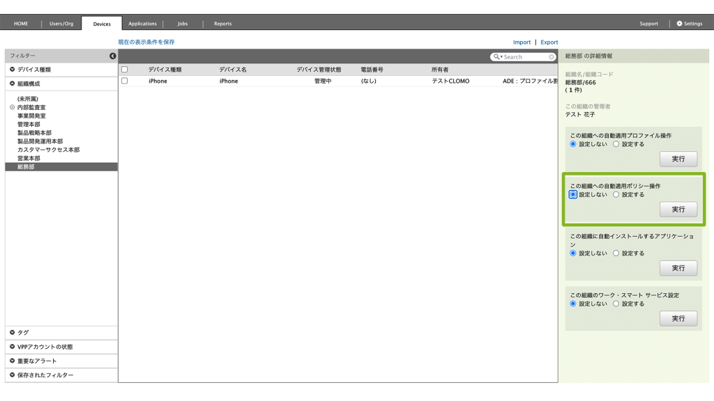 自動適用設定をすると、選択した組織のデバイスに影響があります。内容を十分に確認のうえ、設定をしてください。
