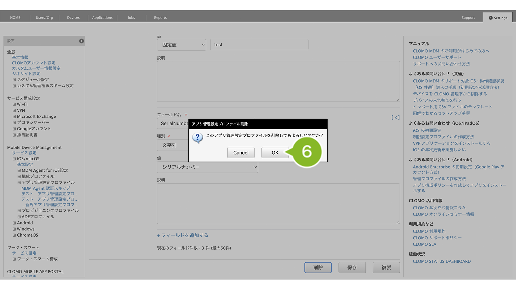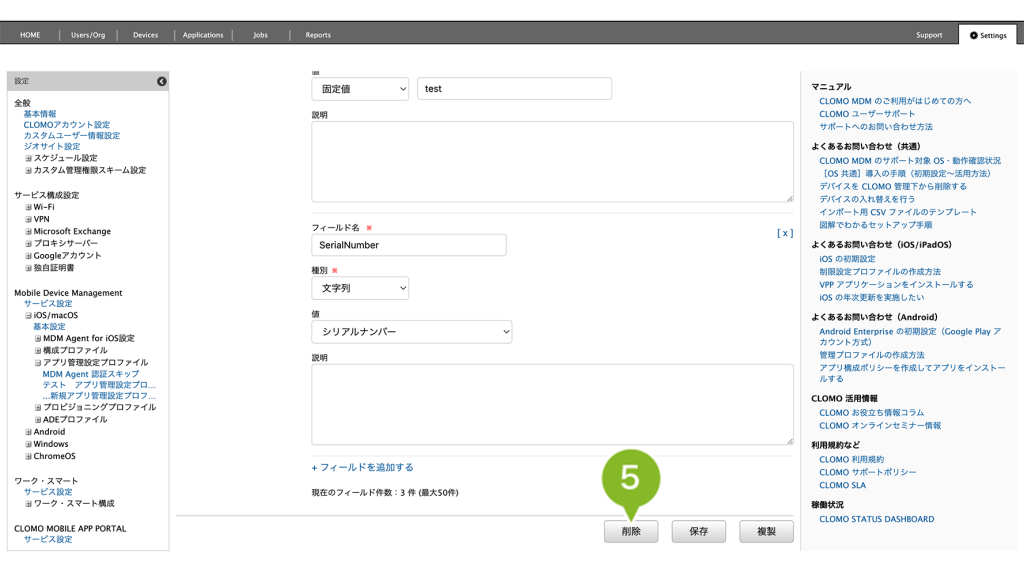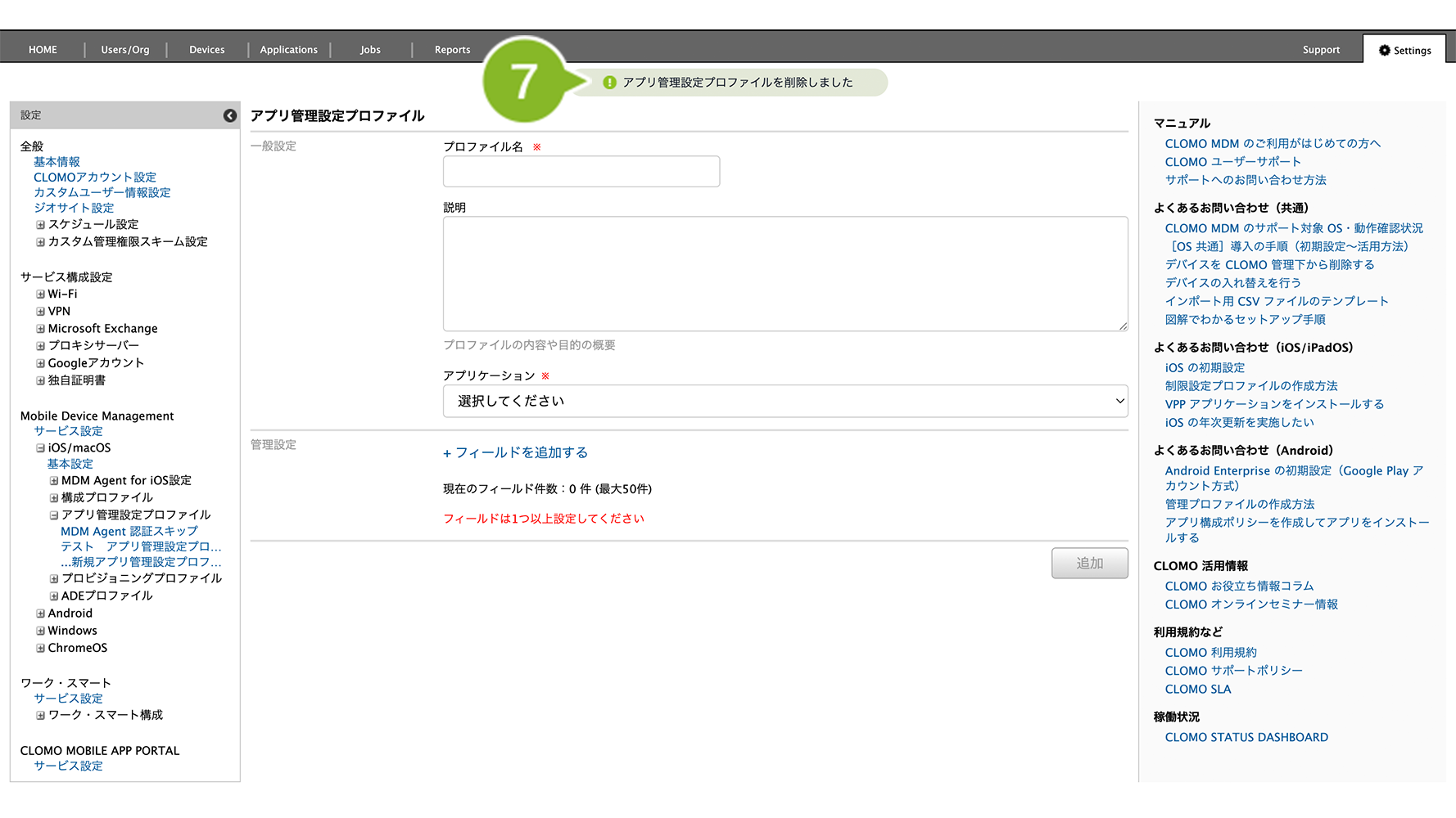 アプリ管理設定プロファイルの削除