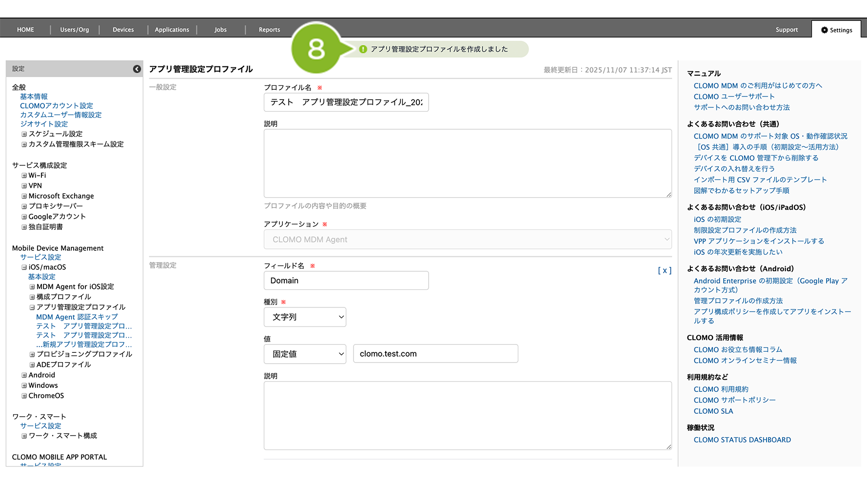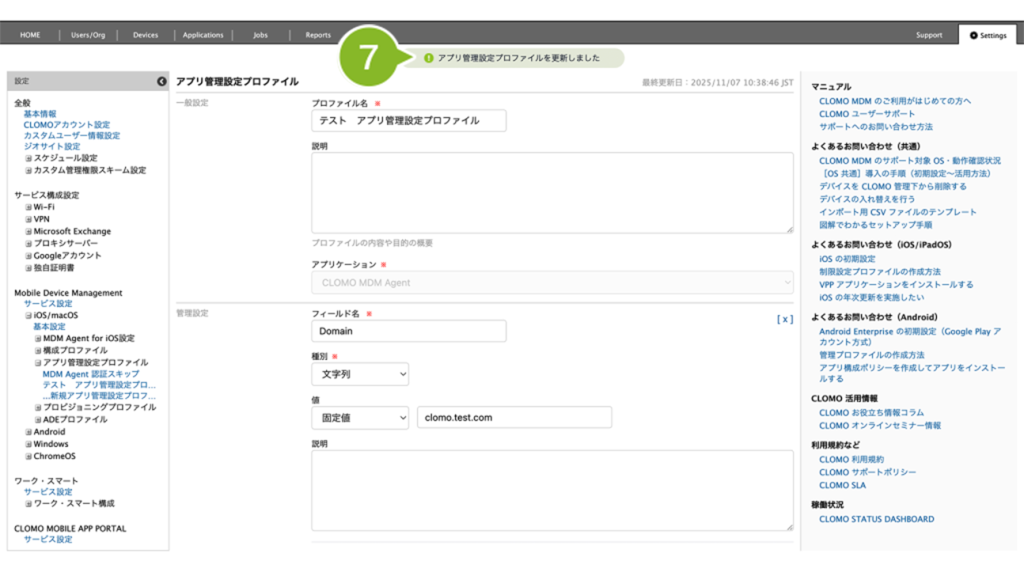 編集完了後、該当の「アプリ管理設定プロファイル」を個別適用しているデバイスには、プロファイルの再適用が必要です。