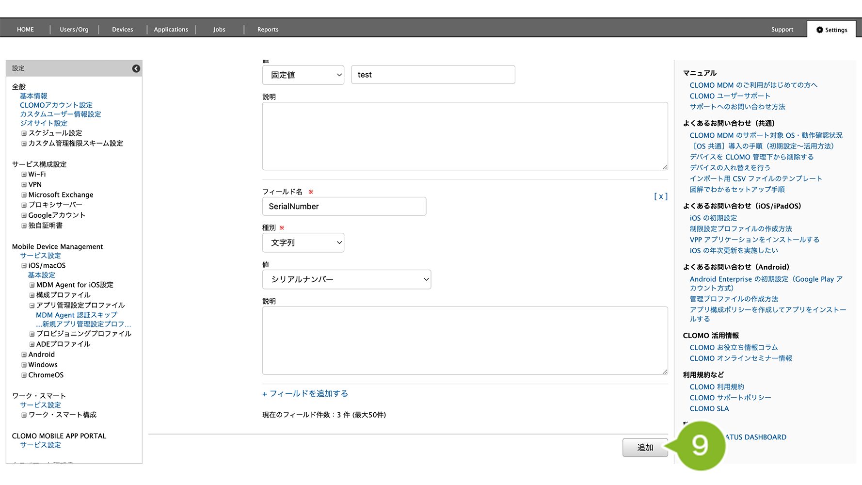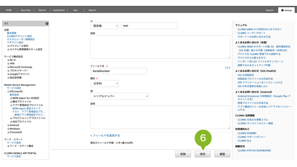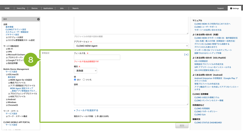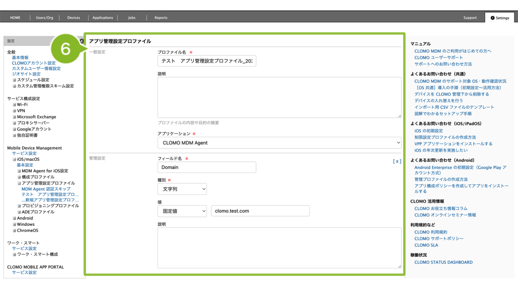 例えば、CLOMO MDM Agent for iOS で初回起動時に必要な「ドメイン」の値をアプリ管理設定プロファイルで設定する場合は、「Domain」と入力します。