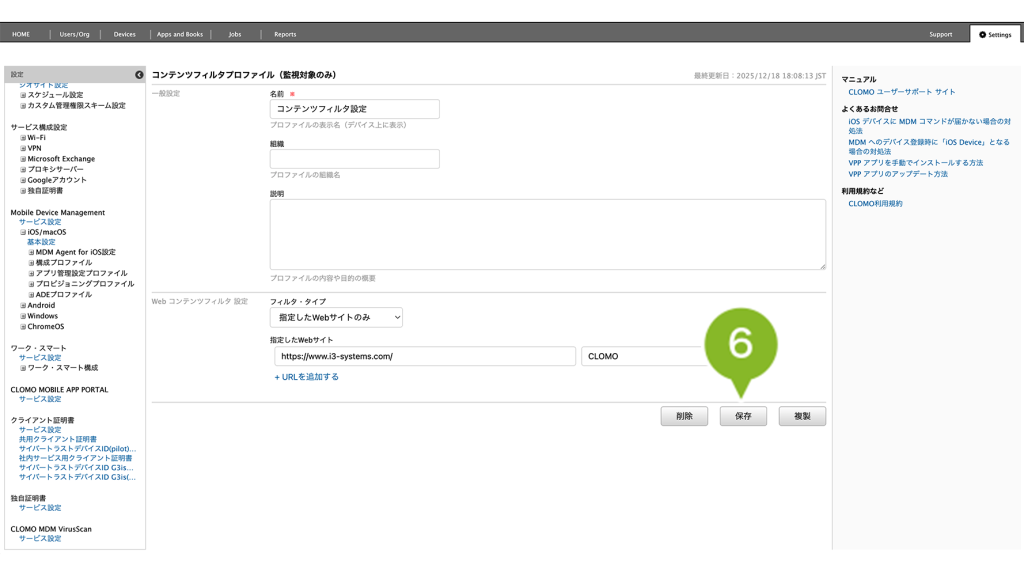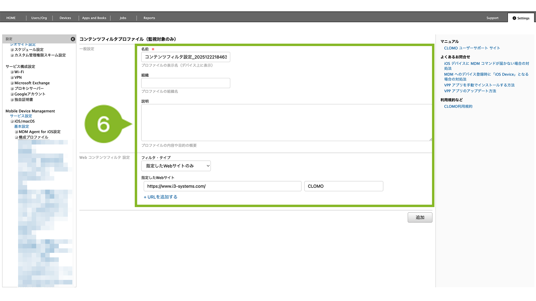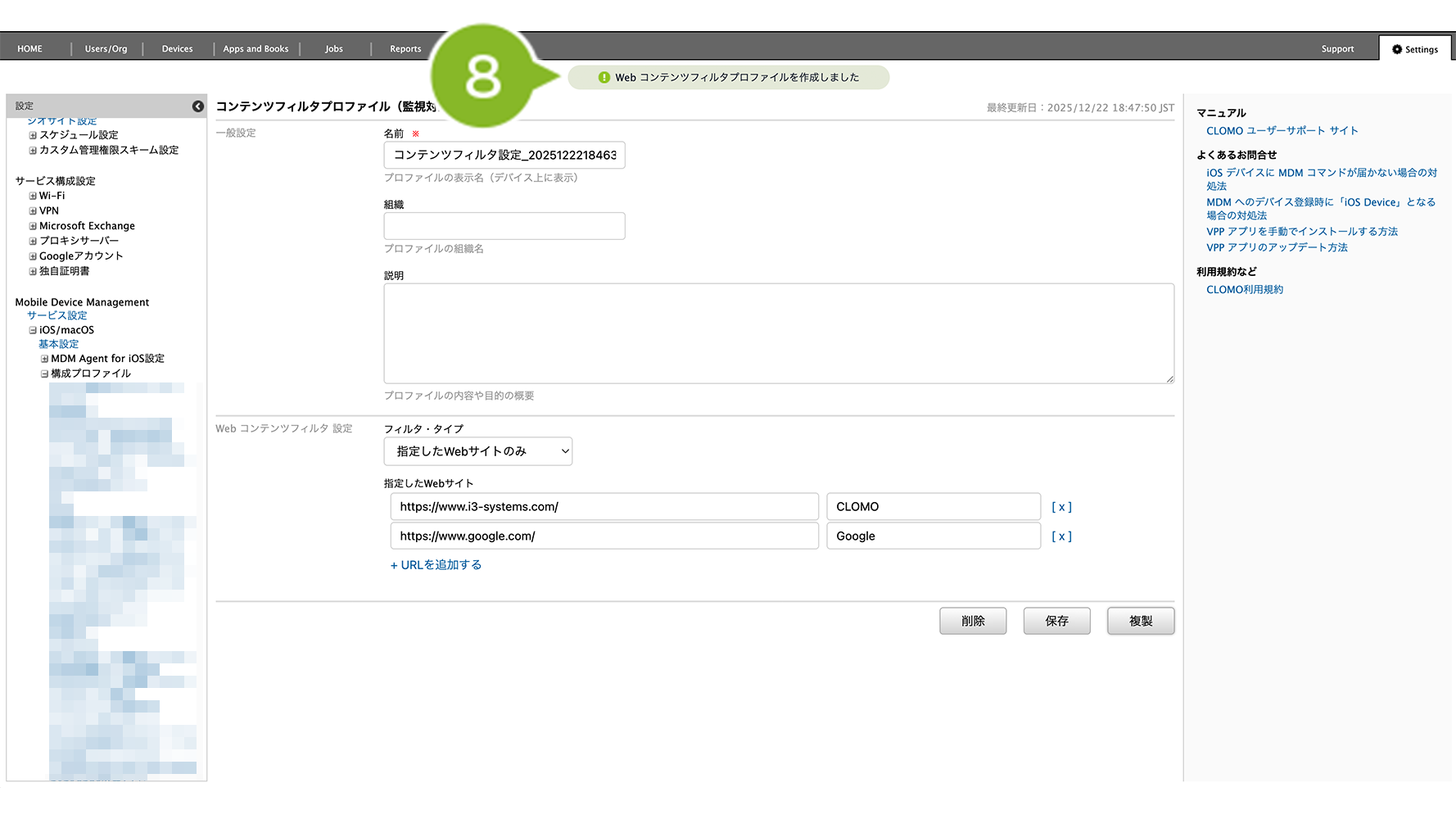 編集完了後、該当の「コンテンツフィルタプロファイル」を個別適用しているデバイスには、プロファイルの再適用が必要です。