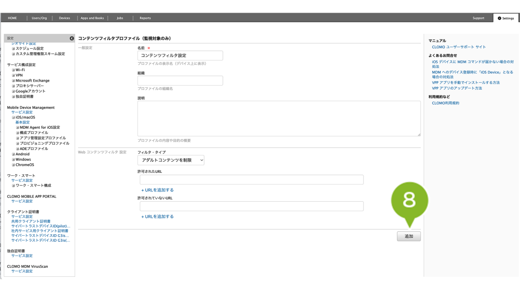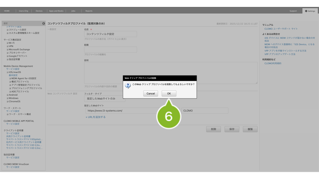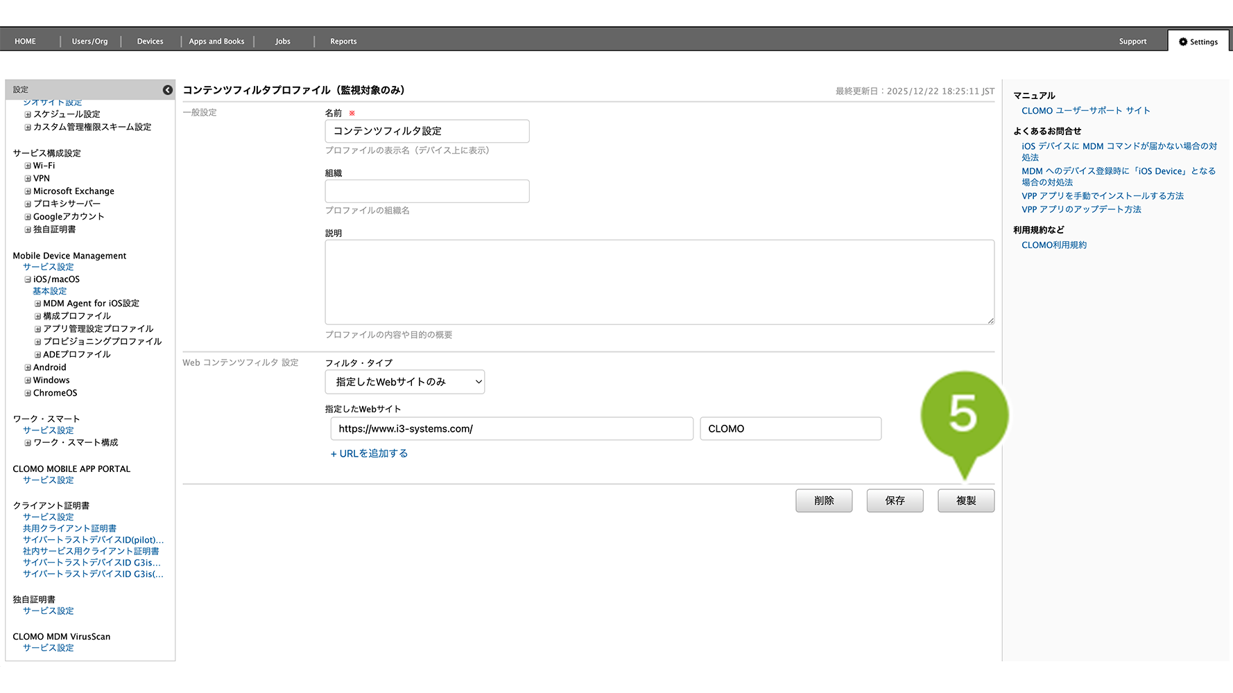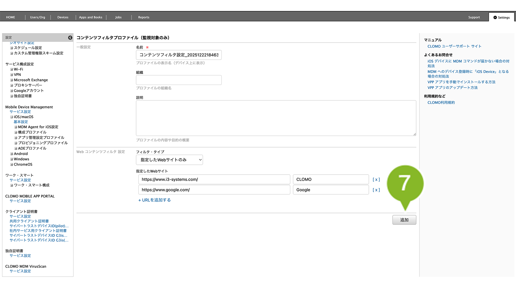 編集完了後、該当の「コンテンツフィルタプロファイル」を個別適用しているデバイスには、プロファイルの再適用が必要です。