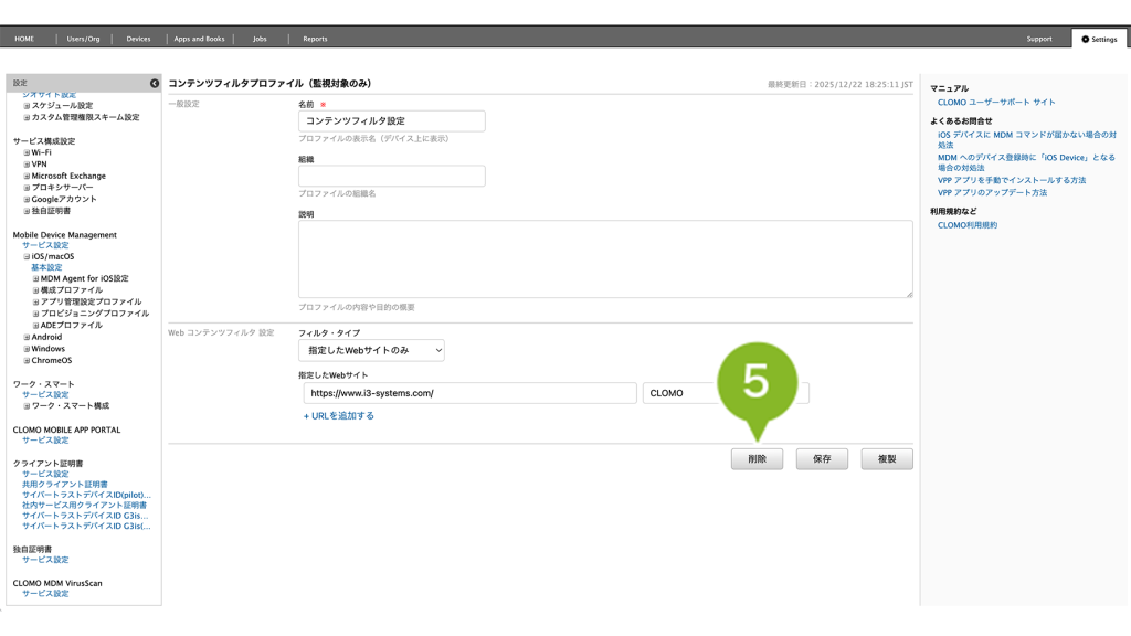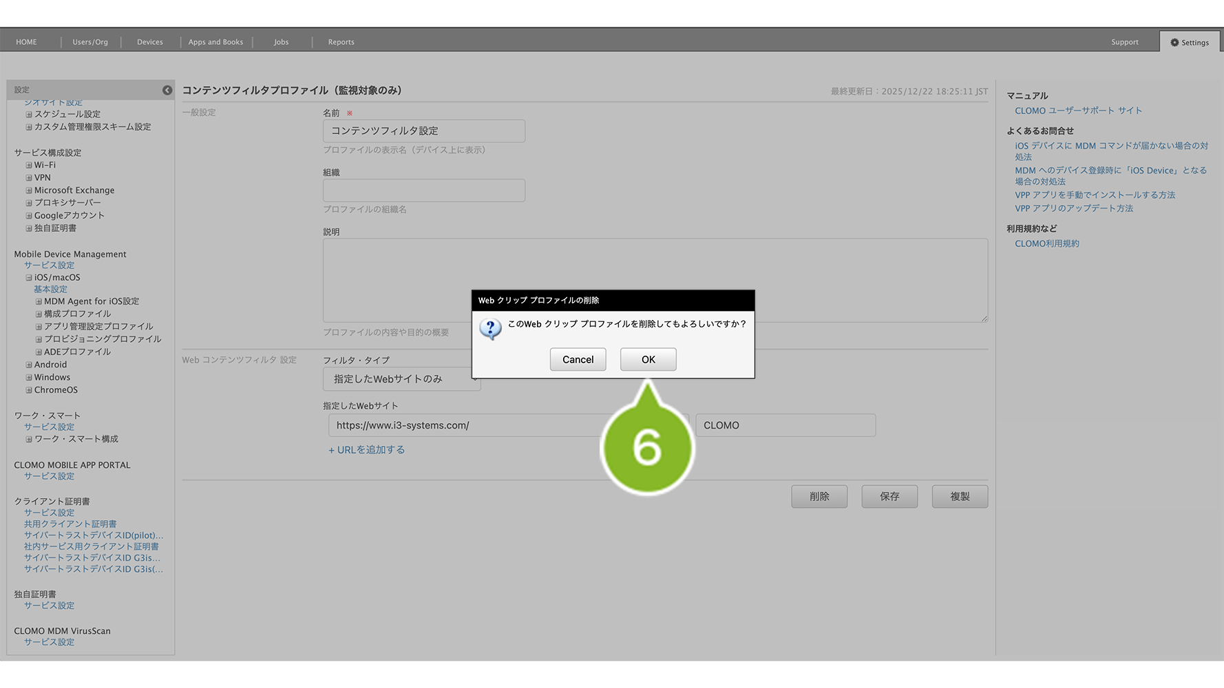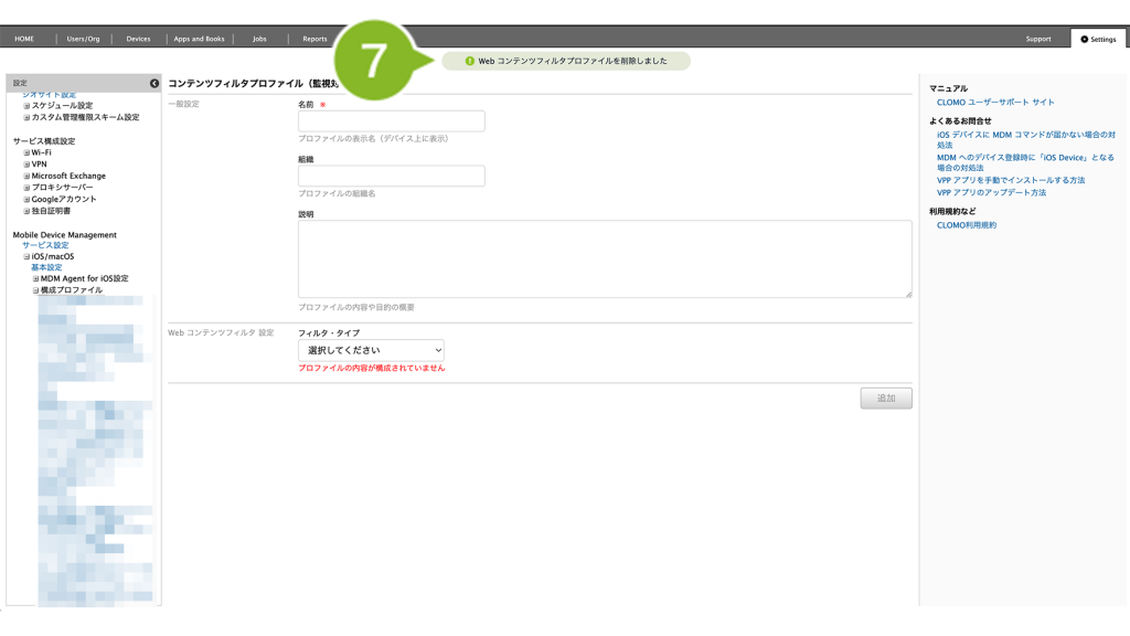「コンテンツフィルタプロファイル」を個別適用しているデバイスには、削除コマンドの実行が必要です。