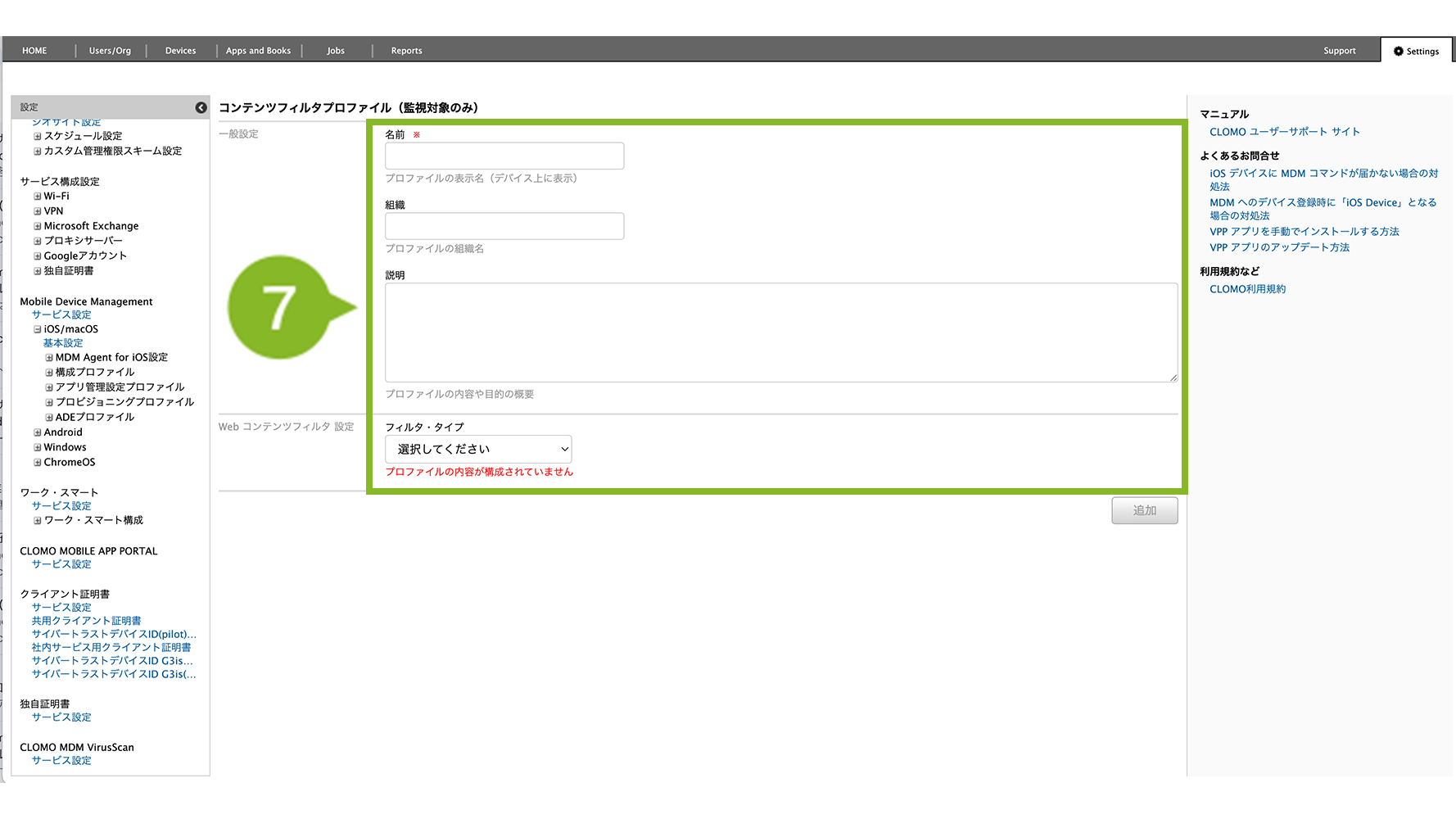 「コンテンツフィルタプロファイル」の作成手順は、以下のとおりです。