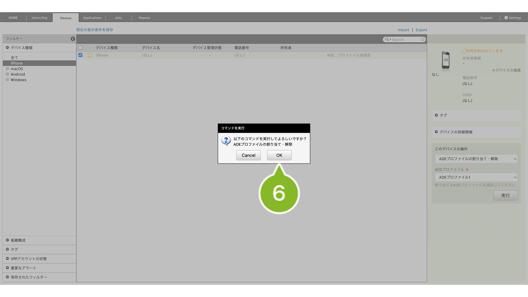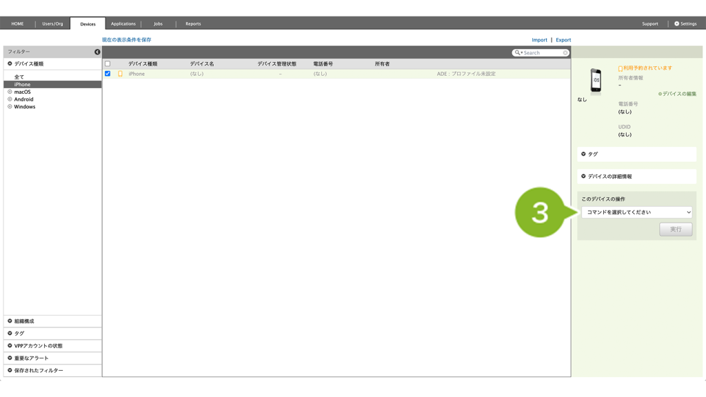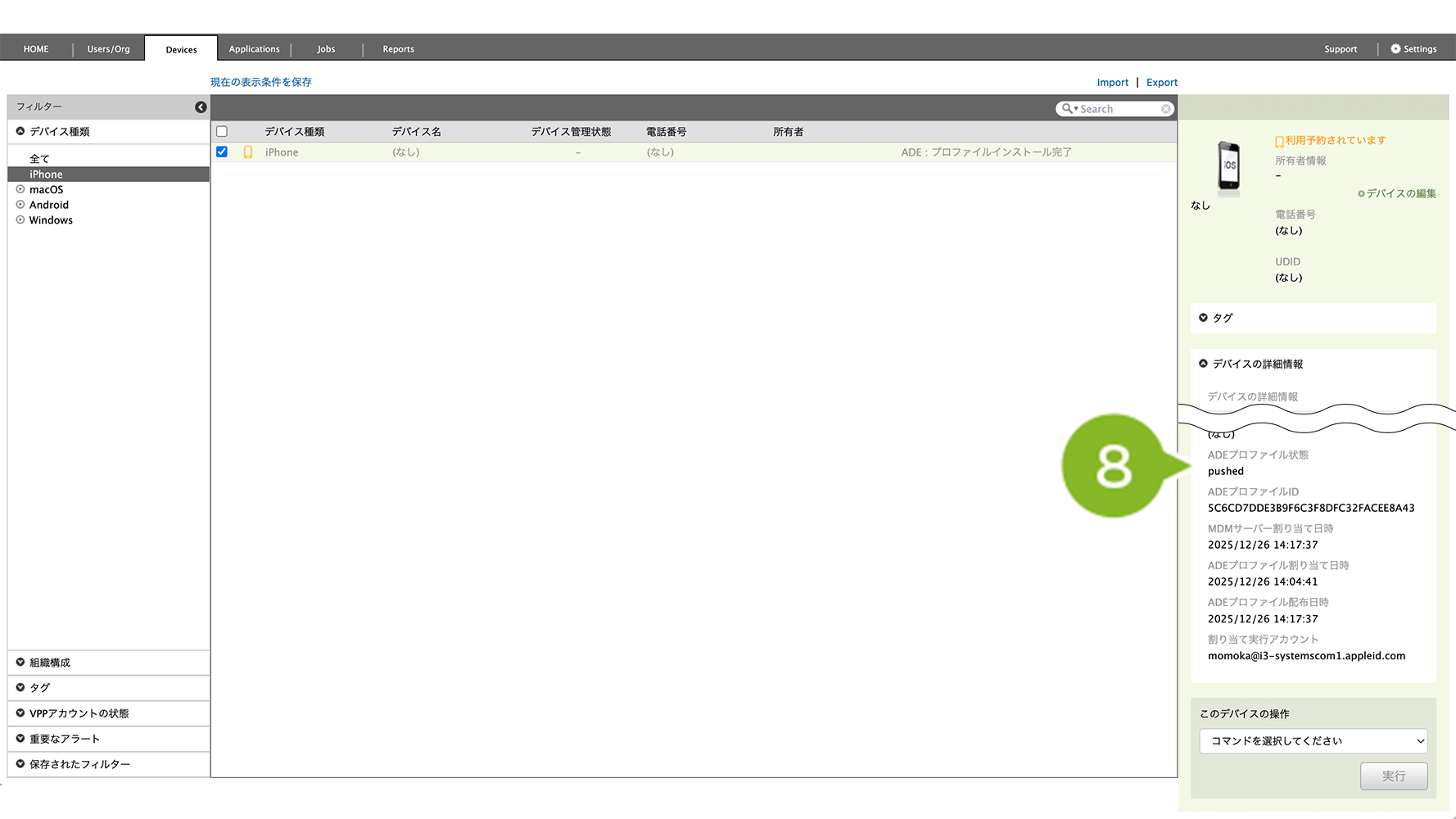 デバイスが登録されていない場合や、「所有解除済み」と表示されている場合は、【iOS】ADE デバイスとして登録されていないデバイスを ADE 化する場合のセットアップをご参照の上、2-2まで完了させてください。