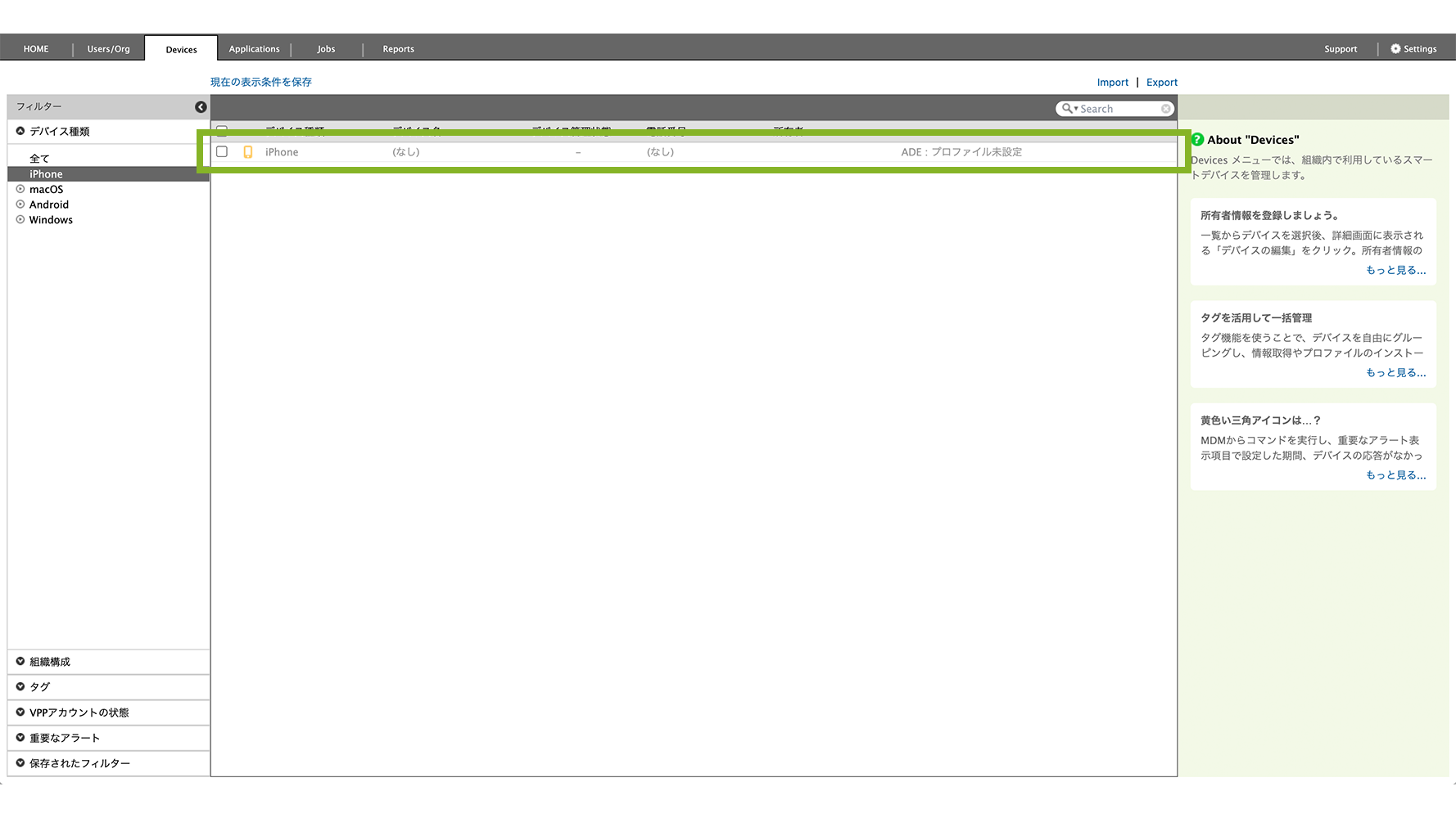 「未割り当て」と表示されている場合は、2-2:ABM / ASMで ADE デバイスを MDM サーバーに割り当てるを実施してください。