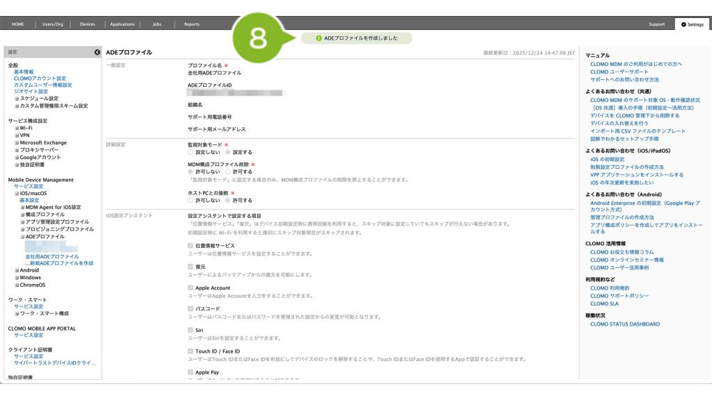 ※ 各 ADE プロファイル状態は、【iOS】「ADE プロファイル状態」のステータスをご参照ください。