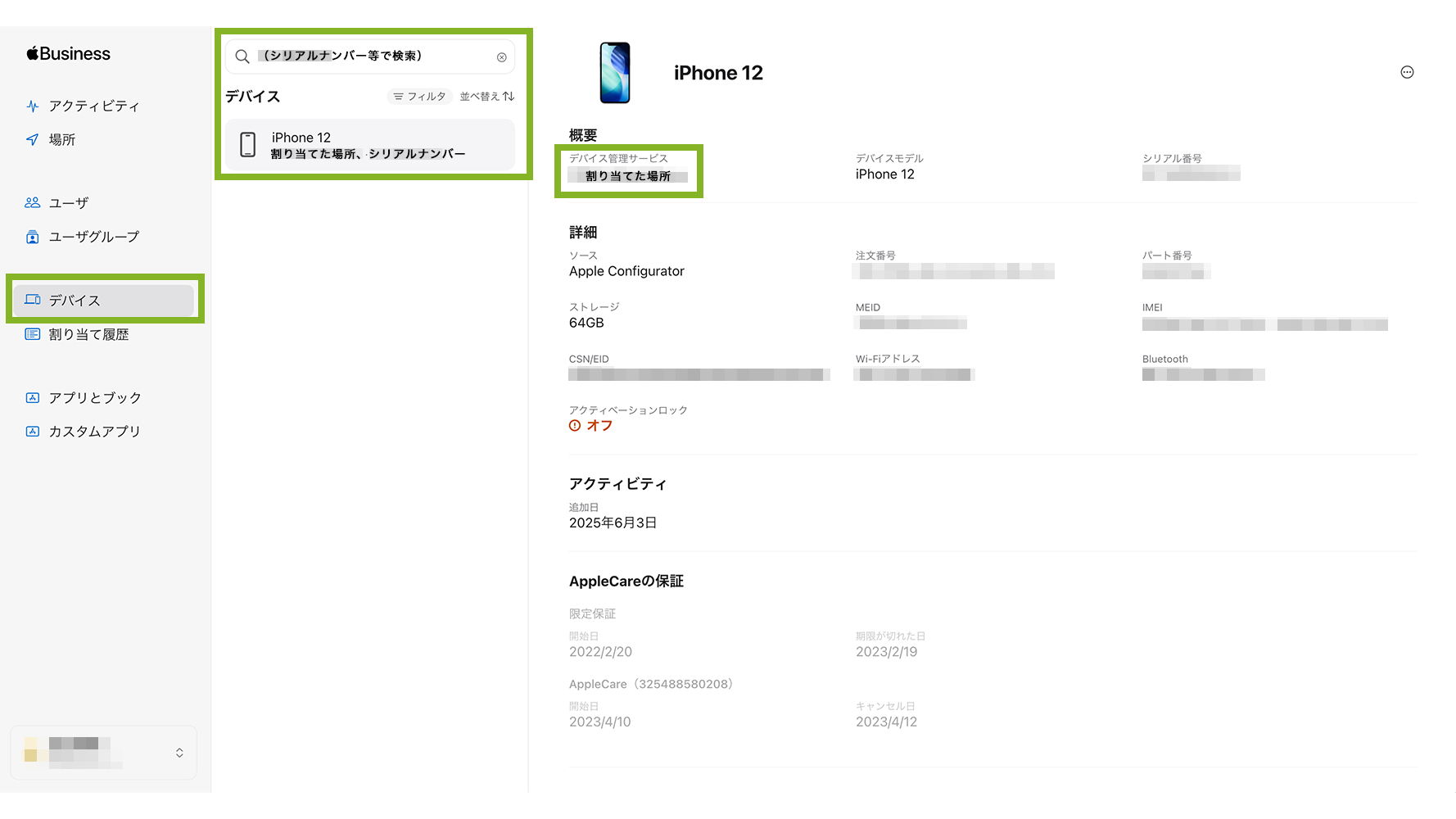 Apple Business Manager / Apple School Manager にログインして、「デバイス」から該当デバイスを検索します。